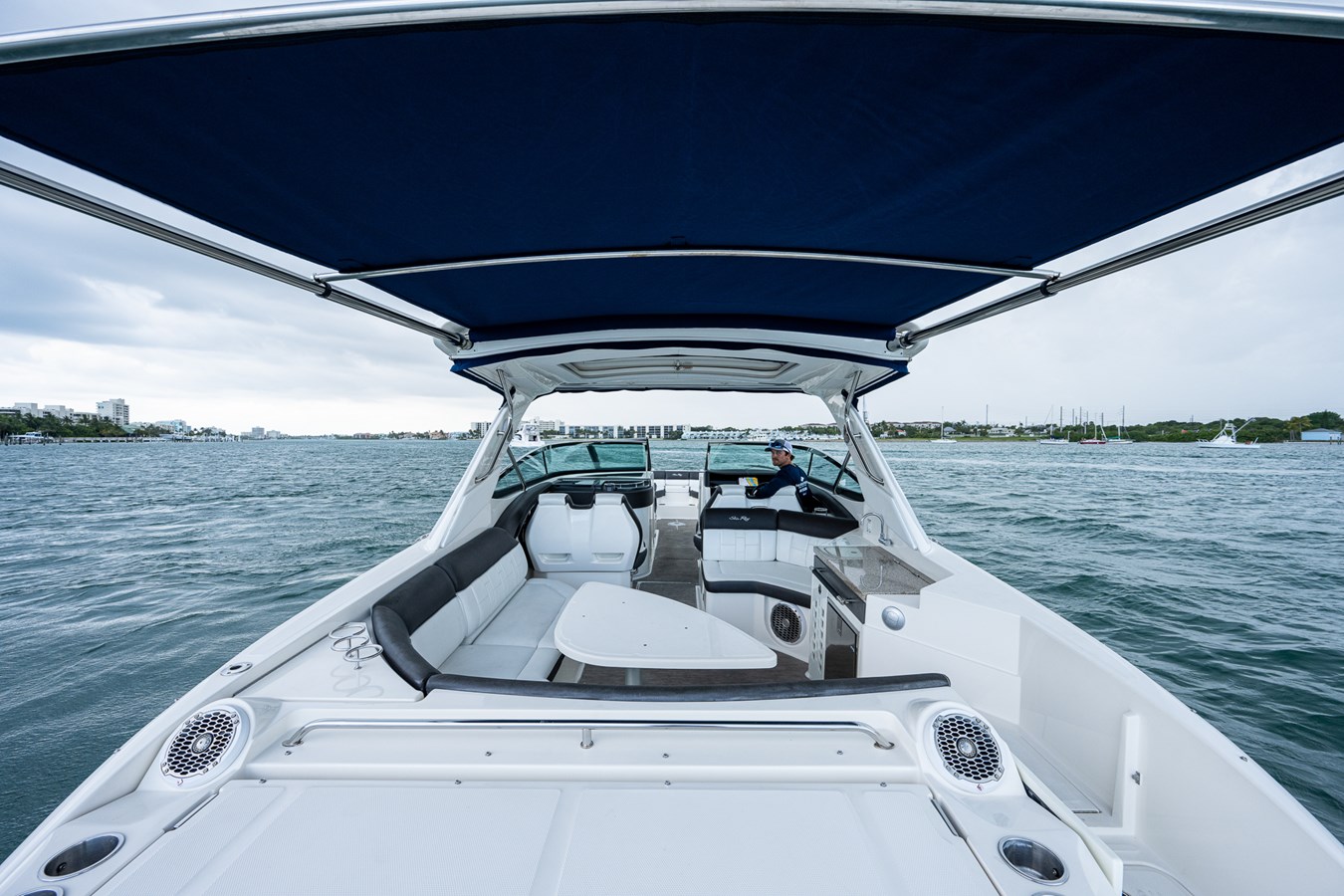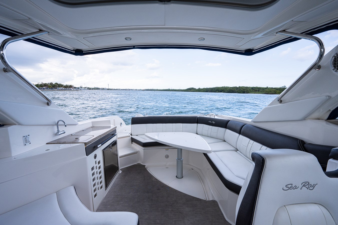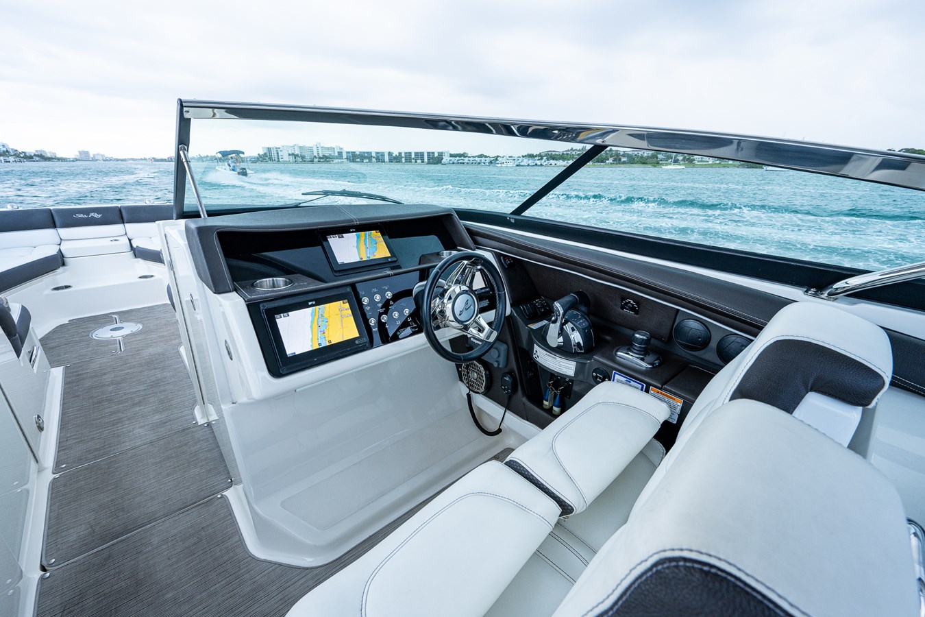 The Sea Ray 350 SLX redefines “day boat” to mean all day and then some. Comfortable seating for 18 passengers underway means connecting with friends, family, even generations. An array of Sea Ray’s Next Wave™ innovations provide a superior experience, from the noise-quashing powers of Quiet Ride, to the precision and stability of Dynamic Running Surface, to the agility of Axius® joystick technology. And a host of intelligent features combine in a sleek, stylish package that far surpasses the typical bowrider. Bow to stern, this 350 SLX is designed to ensure that all day unfolds your way.