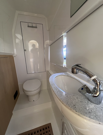 - Galley to starboard with Corian surface, 80 L/2.8 c ft fridge/freezer, storage, wash basin