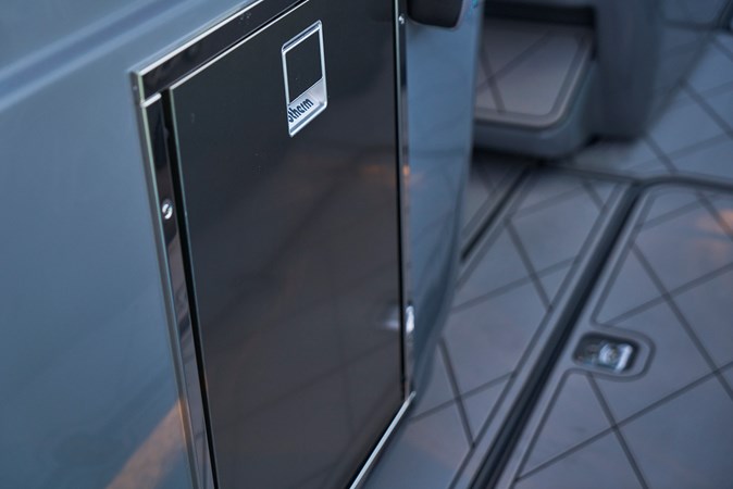 -Oversized stand up console interior with fresh water toilet, sink and berth area