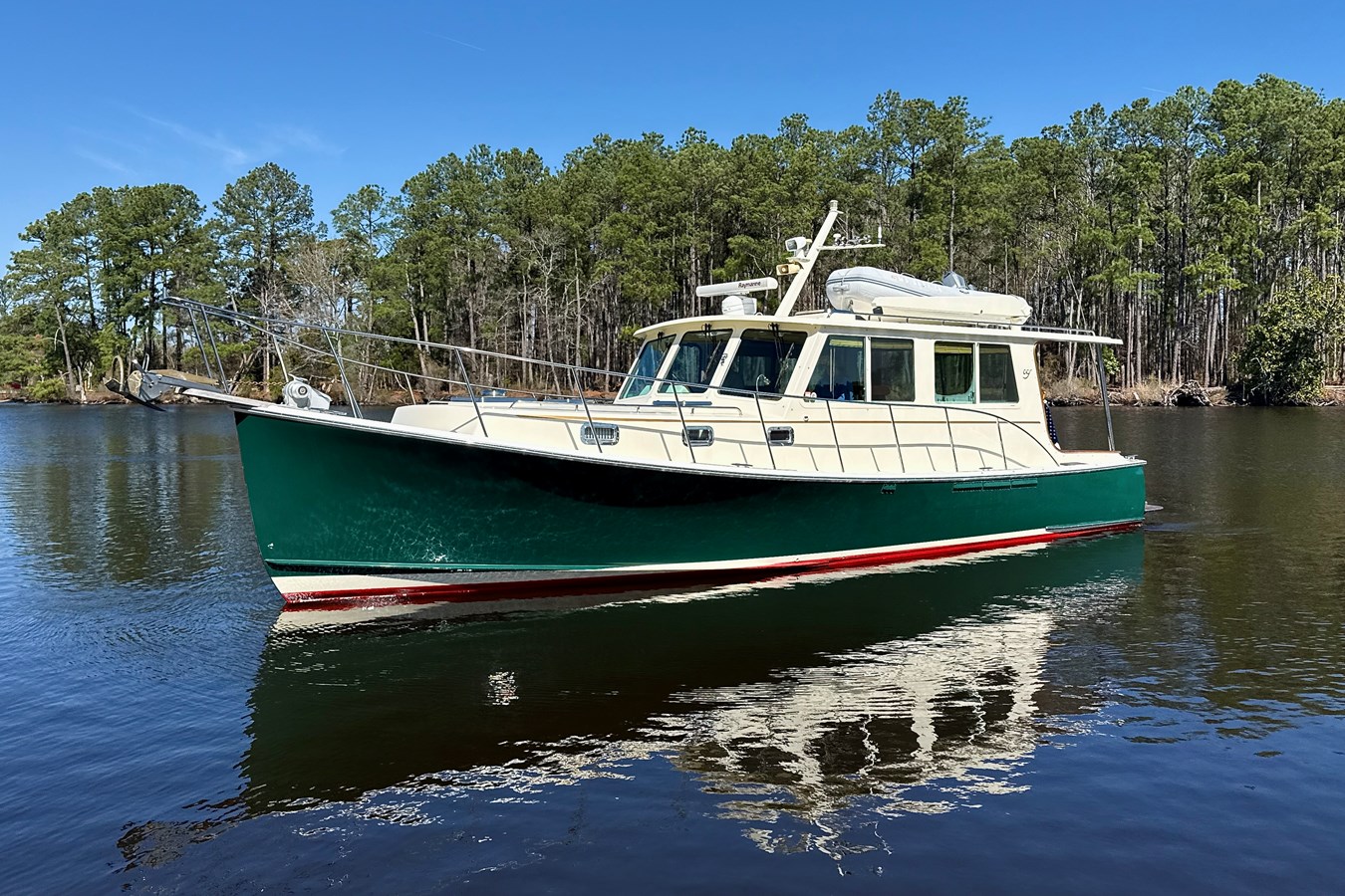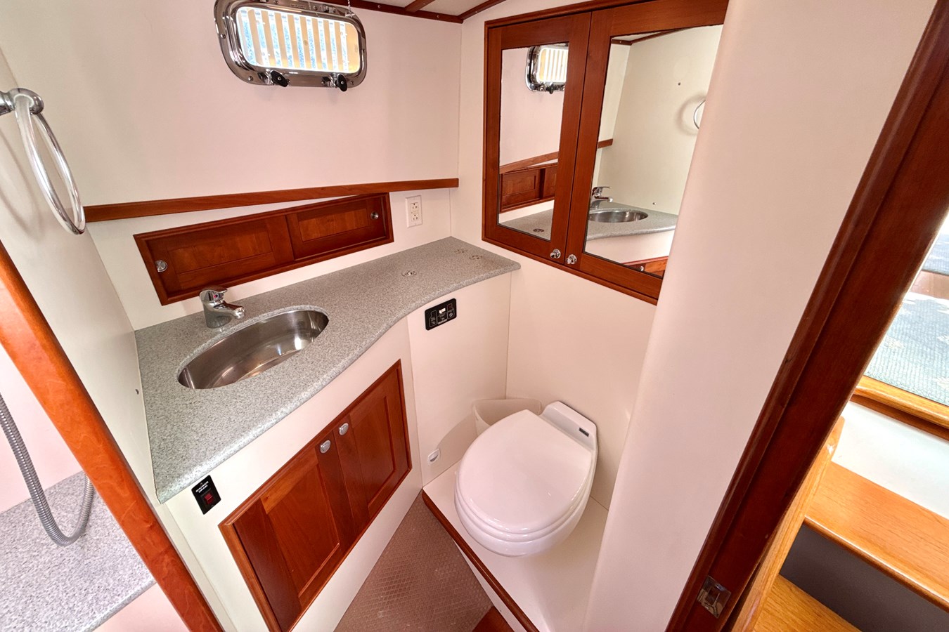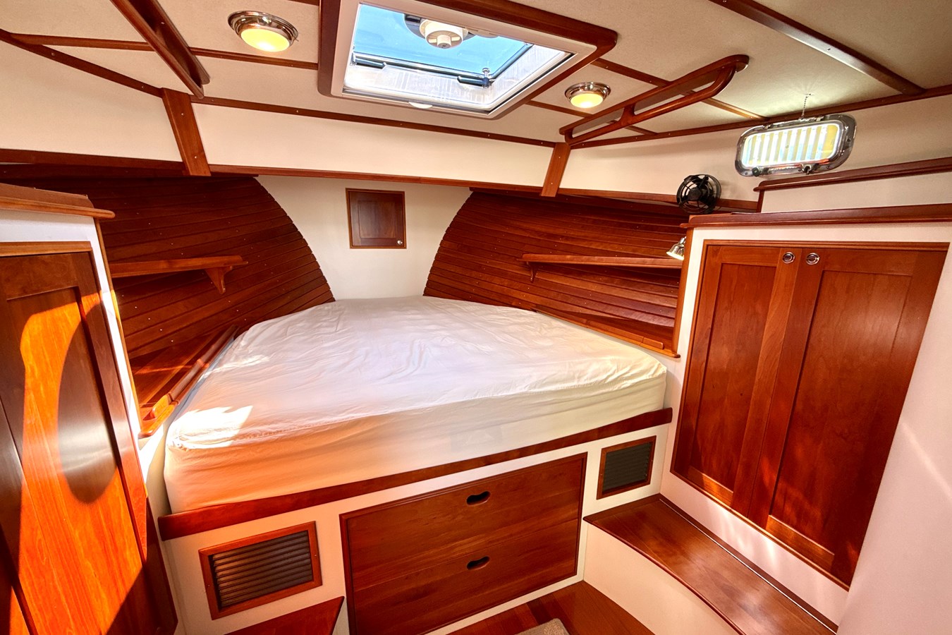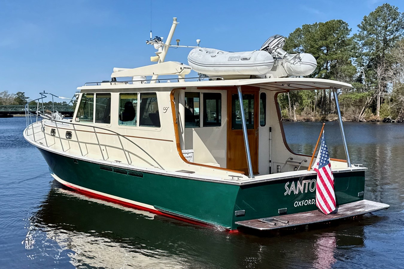 SANTORINI is a Duffy 37 hull completed by Campbell Custom Yachts as an “Atlantic 37”. She’s a stylish and comfortable traditional Downeast yacht with a modern planing hull and full keel. It features a timeless layout with custom berth, full head, formidable galley, and saloon atop a single Cummins diesel engine.