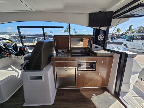 This stunning boat is a must see. Fully Loaded & like new , and the best priced unit on the market . Includes a SEAKEEPER GYRO STABILIZER (+$60k upgrade ), and joystick docking. The upgraded Mercury 350HP Verados are still under warranty (and are upgraded from the standard 350hp engine. 126 hrs The Auto Glide trim tabs provide added stabilization. Also included are the premium electronics package, sky lights, mat grey sea decking in cockpit, side decks, & fore deck. Fusion stereo system with 3 zones, 4 JL Audio Speakers Private stateroom forward, and private stateroom aft. Extremely spacious for 35,’ lots of volume. Great for the Escape and day trips, or you can sleep the whole family.