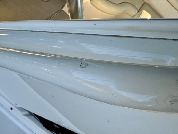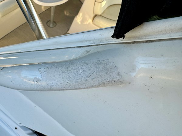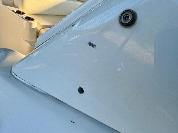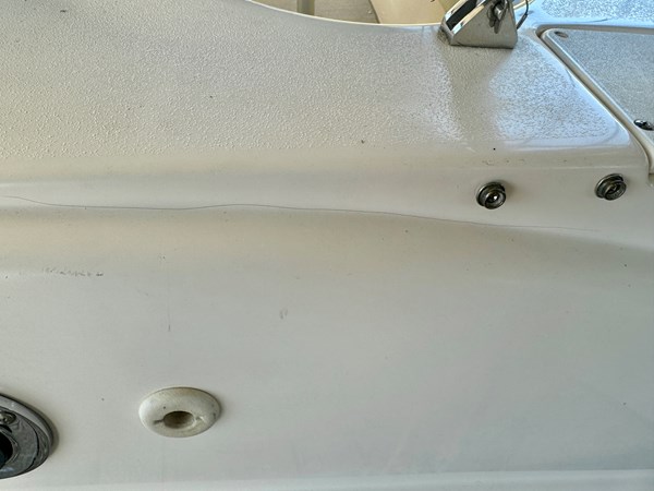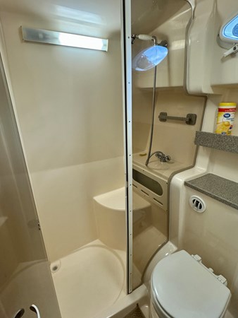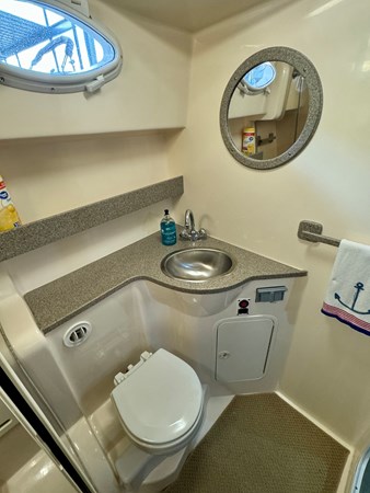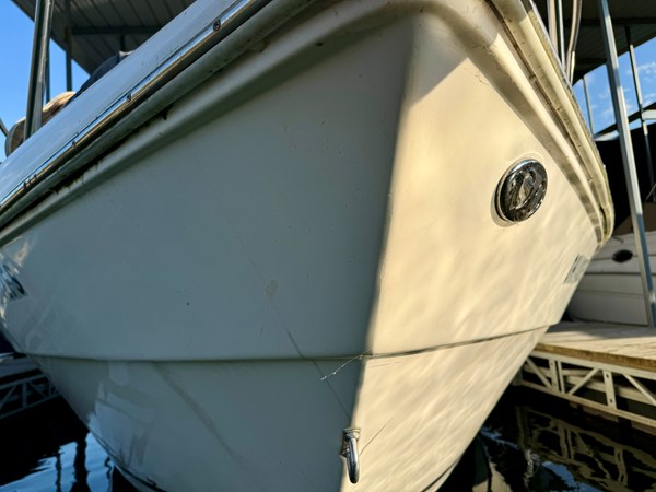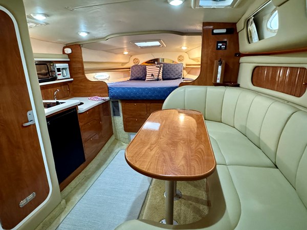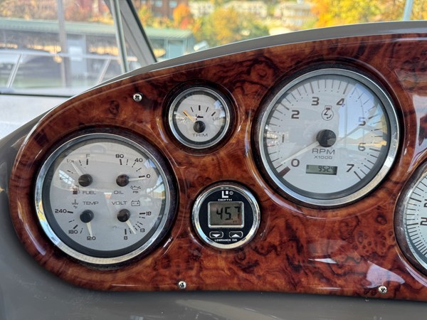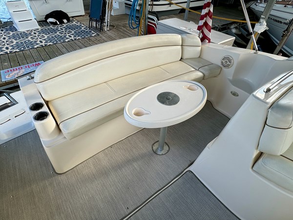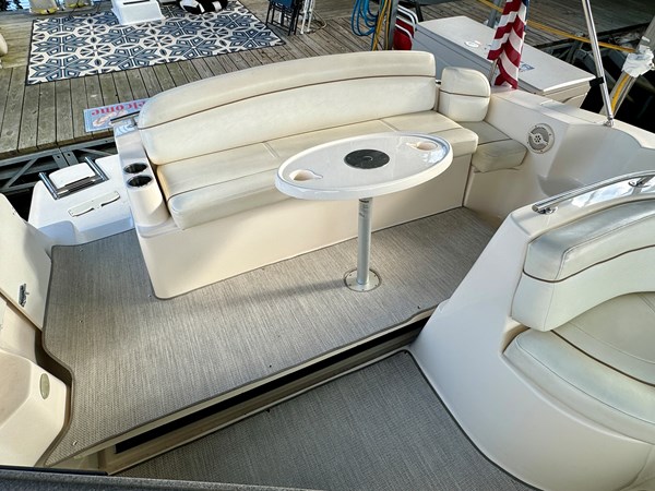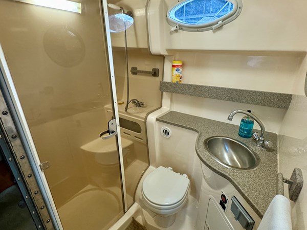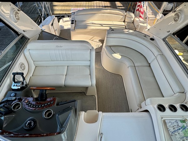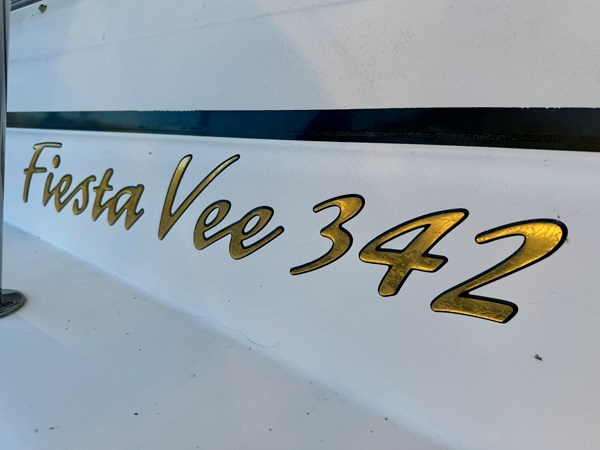 This Fresh Water 2004 Rinker Fiesta Vee 342 Cabin Cruiser For Sale on Norris Lake Tennessee is powered by twin Mercruiser 350MAG MPI V8 Inboard/Outboard Engines with Bravo III Dual Prop Outdrives and a Kohler Generator in a soundbox and features sleeping for 5-6 in a v-berth, convertible dinette, and a mid cabin with a roomy head that has a separate shower stall, an electric flush head, and a vanity sink. The cabin’s 6′ 10” of headroom is heated and cooled with a marine air conditioning unit with reverse cycle heat while other creature comforts are provided via the galley’s ac/dc refrigerator, dual electric range cooktop, an integrated microwave, coffee maker, and sink with a 24” LED smart roku tv integrated into a cabinet for rainy days or cloudy evenings. In the cockpit you’ll find another ac/dc fridge as well as an under-counter freezer, integrated blender and waste bin. Comfort is assisted in the cockpit by an overhead dual bimini top that includes an isenglass/camper canvas enclosure, woven vinyl snap-in flooring is underfoot, and a removable lounge table, stereo, and plenty of stainless cupholders throughout allow for easy entertaining. At the helm you’ll find a double wide helm seat with driver bolster, a depth/fish finder/sonar, gps chartplotter/radar, vhf radio, controls for a remote spotlight, windlass anchor, hydraulic trim tabs with an indicator, and much more. Other highlights include a central vacuum system, a bow sunpad cushion, an extended swim platform with swim boarding ladder, and a hot/cold transom shower. The covered slip on Norris Lake Tennessee is transferable.