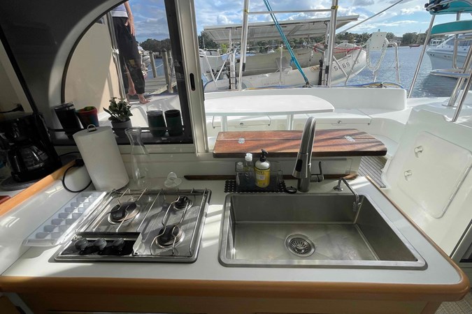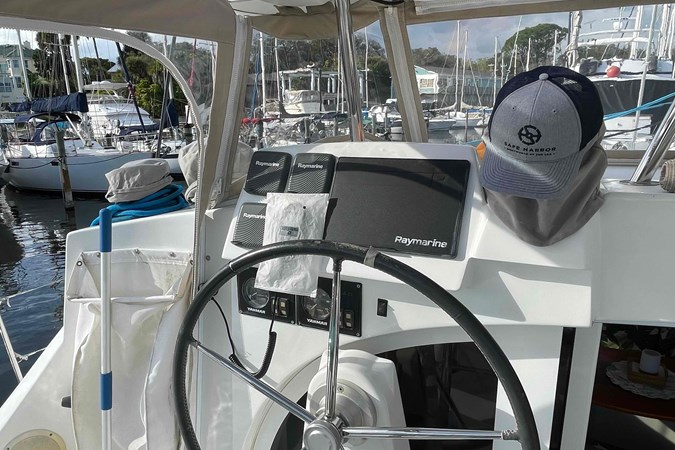 The Lagoon 380 cockpit is spacious, with the raised helm offering 360 degree visibility under cover of the bimini. The side decks are wide to provide safe and comfortable transit to the bow area and the trampolines either while underway or moored. All lines lead back to the helm, including main halyard, reef lines and the starboard genoa sheet, making the boat safe and relaxing to sail.