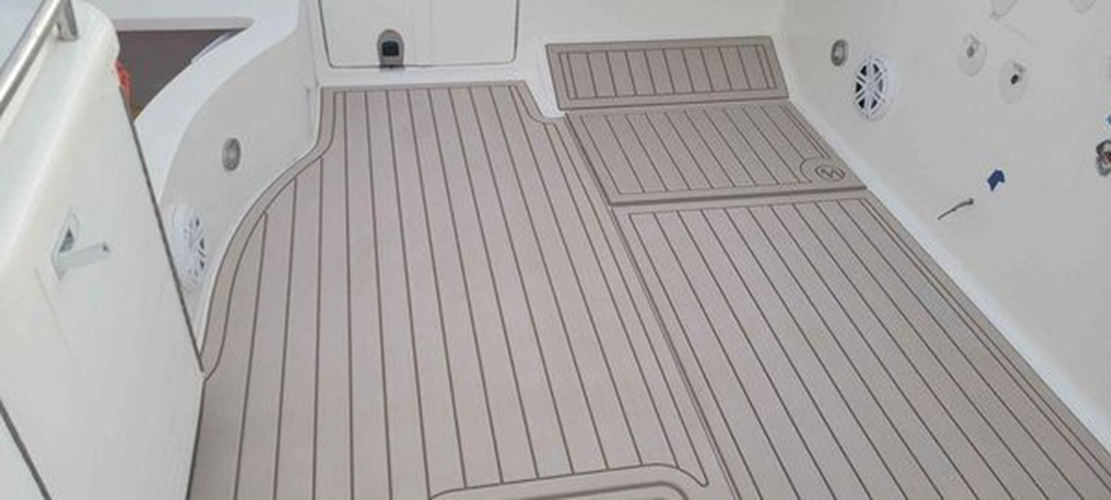 Cockpit exterior diamond stiched seats with lifetime solar guard thread and lifetime embroidery, sea deck, rubber floors in cabin,