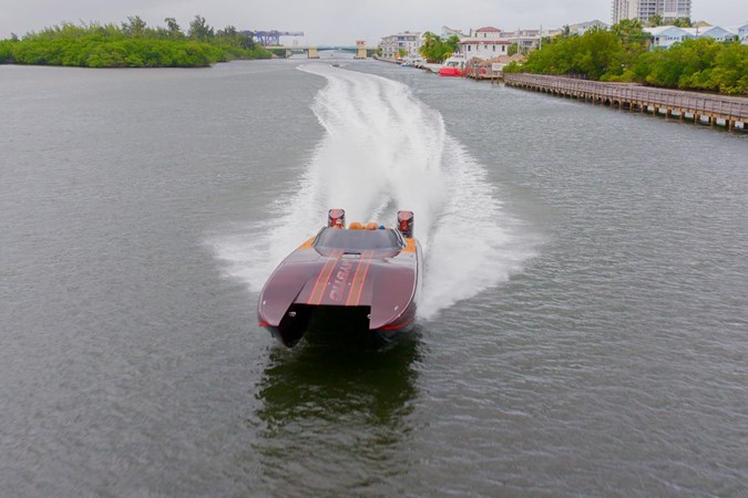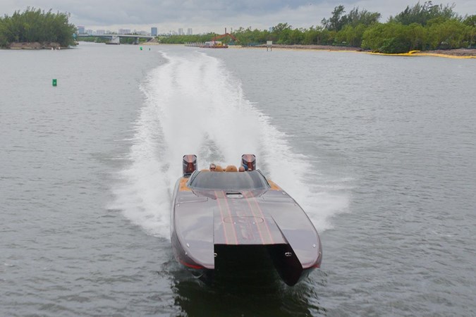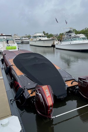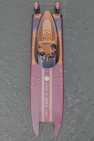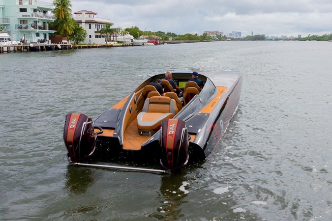 In this C4000 Mystic Powerboats has delivered a full carbon fiber hull and offers the rare combination of racing speed and luxury. The comfortable interior consists of 6 forward facing and two rear facing seats that still look brand new. The low positioning allows for a surprising amount of shelter from the wind as the boat glides along. The soft sea decking compliments the boat very well and also provides safe transit through the seating area.