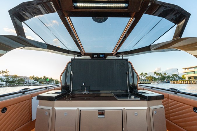 Al fresco dining is catered for thanks to a well-equipped galley plus lots of storage space, a sink and refrigerators/wine coolers throughout the yacht.