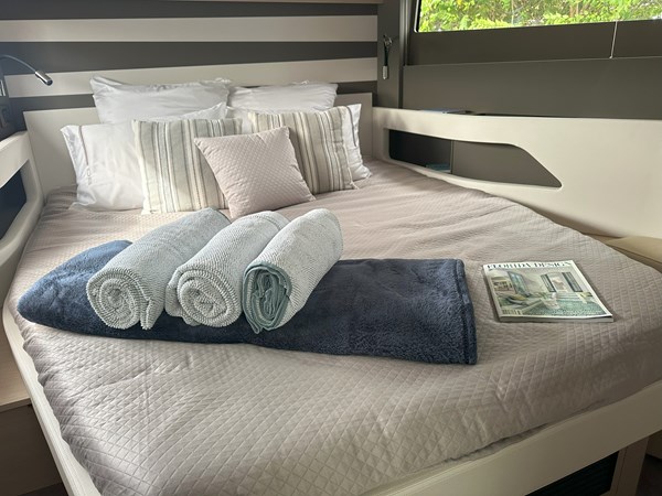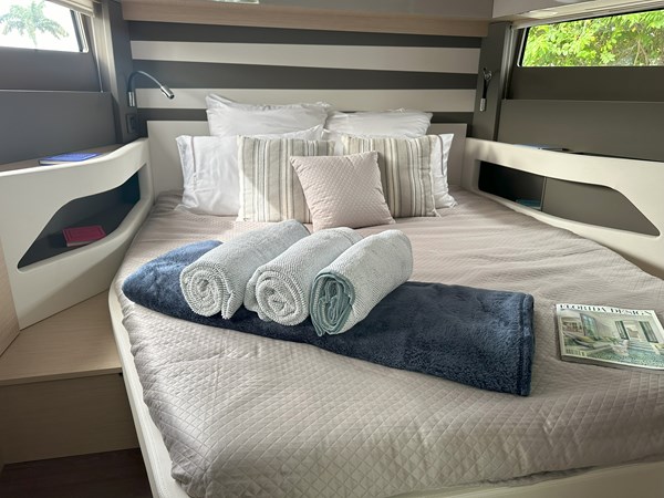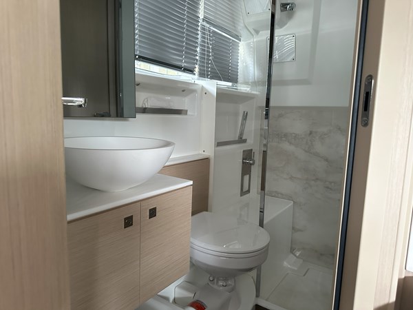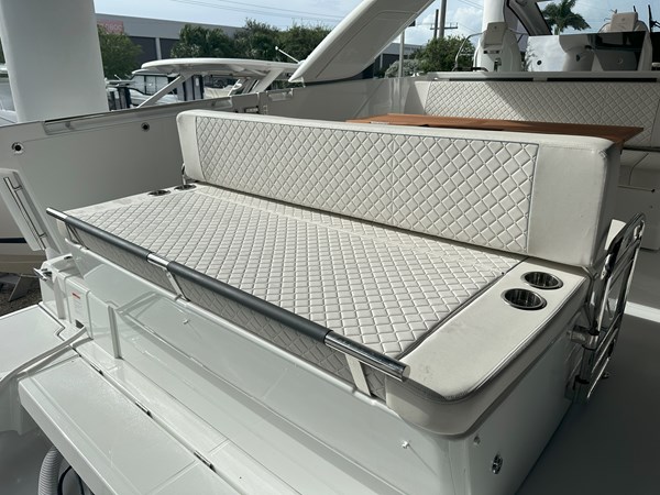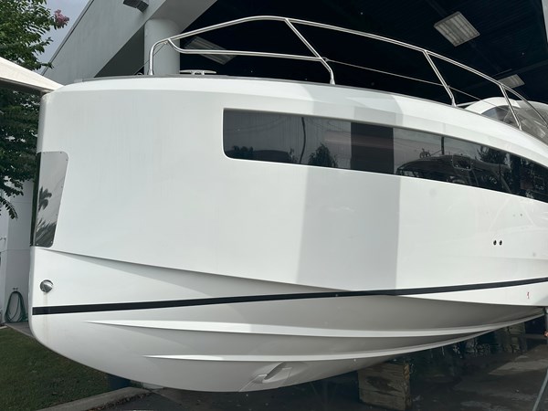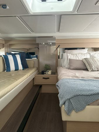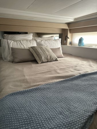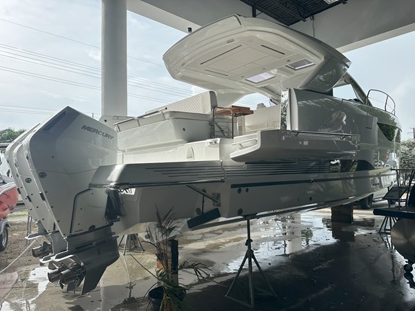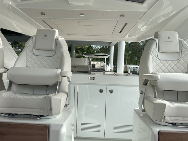 The 2024 Jeanneau DB 43 is a luxurious and high-performance outboard-powered cruiser that redefines the dayboat experience. With an overall length of 44’5″ and a beam of 12’6″, it offers a spacious and stylish platform for both relaxation and adventure. Powered by triple Mercury 350 HP outboard engines, ensuring thrilling performance on the water. Designed by Michael Peters, the hull provides exceptional seakeeping abilities and comfort during cruising. The exterior features a spacious cockpit with a modular table accommodating up to eight guests, a centrally located galley island, and deployable side terraces that extend the swim platform, creating a “Beach Club” atmosphere. Below deck, the interior boasts two cabins: a forward master suite with an island berth and a full-beam guest cabin, both offering luxurious finishes. The head compartment includes a separate shower stall, enhancing onboard comfort.
