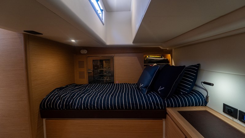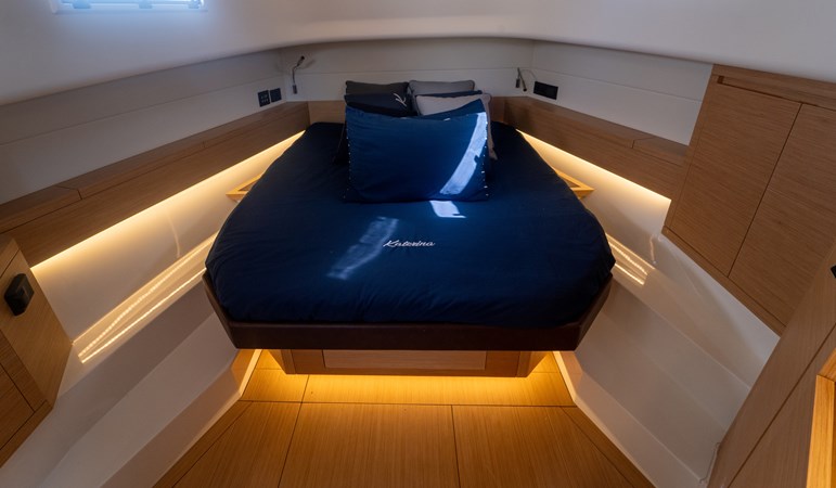 Accommodations: Full walk-around deck layout, spacious cockpit with sunbed fore and aft, generous galley area, two cabins (owner’s forward + twin berth or storage aft) and head with separate shower.