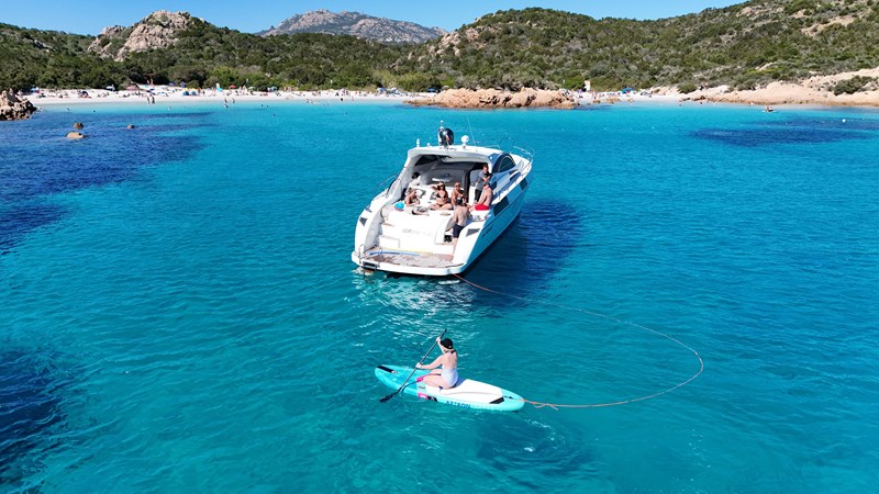 The Rizzardi 45 Incredibile is a sporty-luxury yacht measuring approximately 14.8–15 meters in length with a beam of around 4.4–4.5 meters. It is powered by two MAN engines of about 730 HP each and can accommodate up to 10 guests across three cabins and two bathrooms, depending on the version. The yacht features a teak cockpit and deck, a bimini top, sunbathing areas at the bow and stern, a stereo system, refrigerator, shades, a swim ladder, and often snorkeling gear or a SUP. Designed to combine speed and agility with comfort and relaxation, it is ideal for day cruises or weekend trips.