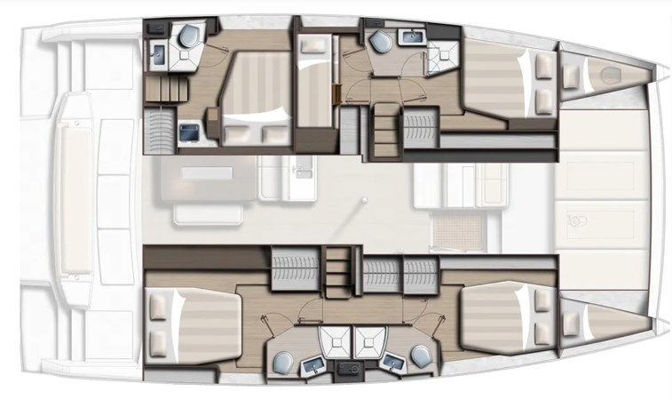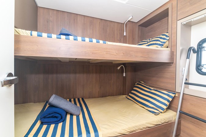All four double cabins are en-suite with separate shower areas, while the additional twin bunk cabin makes the yacht ideal for families or mixed groups. The forward starboard locker is fitted out as a skipper’s cabin.