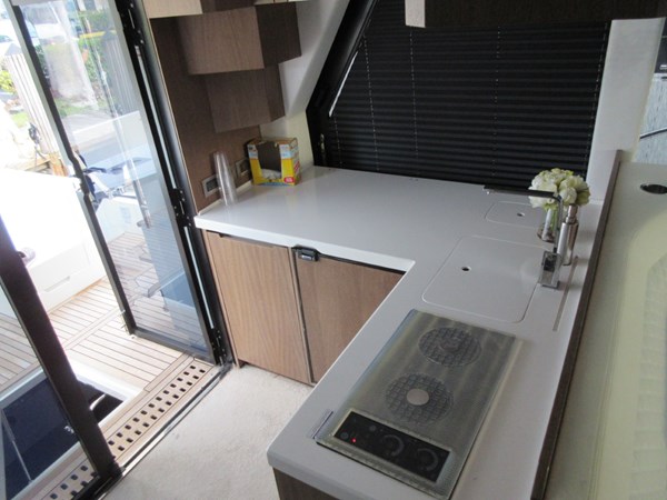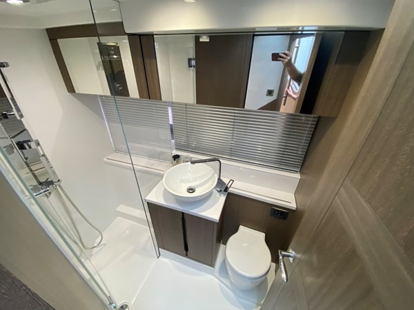 The main deck is fitted with a galley, dinette and plenty of storage areas to stow away items. The optional Beach Mode allows to drop down both sides and create a vast area near the cockpit, perfect for entertaining guests. Three different cockpit solutions are available, including the popular roto-seat option. Bow area can be fitted with an automatic settee for even more convenience outside. Down below three cabins and two bathrooms await the guests. The guest cabins offer a double in the bow area, and bunk beds starboard side. The owner’s cabin is located midship with an ensuite bathroom for extra privacy.