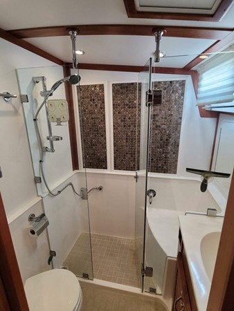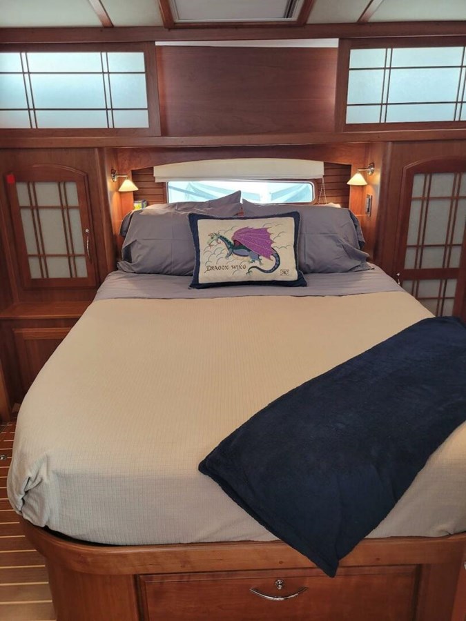 The guest stateroom is forward and is well separated from the owner’s stateroom.