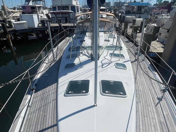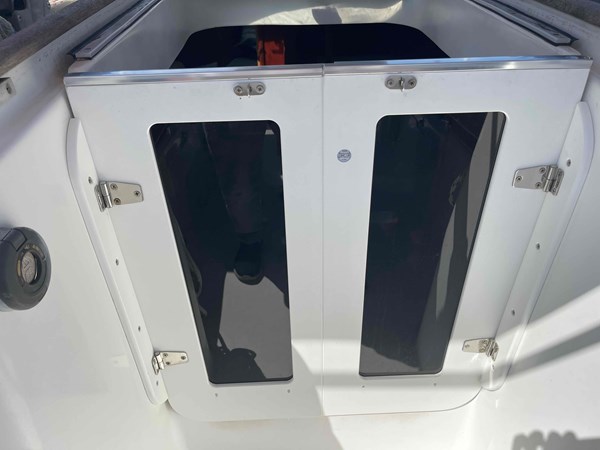The aft cabin is to port of the companionway & has a large double berth & storage locker. It is accessed through door in the port, aft bulkhead. Forward of that is the aft head which can be accessed from the cabin or from the salon. Between the head and the port settee is the forward facing nav station with ergonomically friendly seat that has storage below.