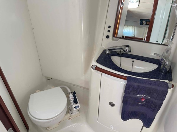 The door to the forward/master cabin is offset to port. The cabin has plentiful storage with cabinets to port and to starboard and beneath the bunk. Three opening hatches provide ventilation and light. A queen-sized berth can be accessed from either side at the foot and has drawers beneath. The head is to starboard and has a separate shower stall.