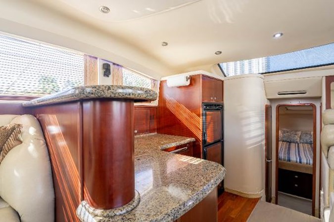 • Comfortable Aft Deck : Enclosed with isinglass for all-weather enjoyment, featuring a wet bar and plenty of seating for entertaining.