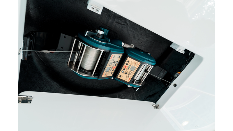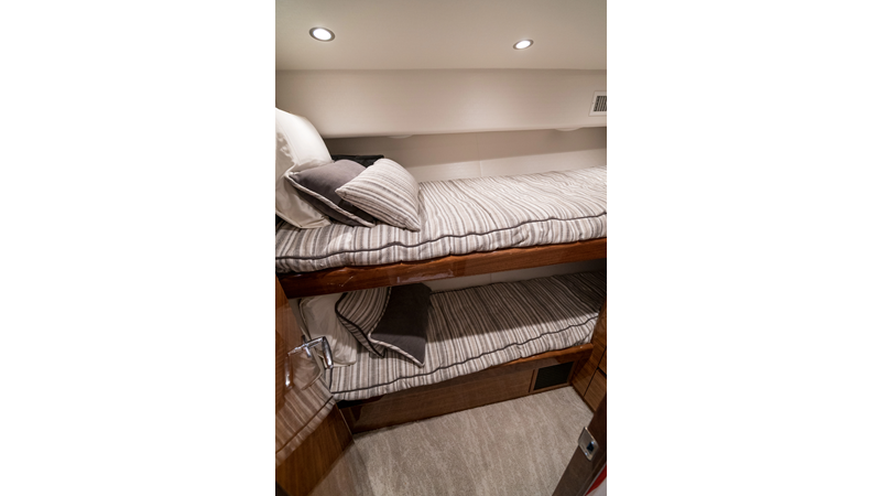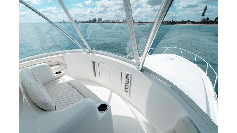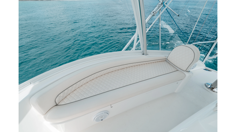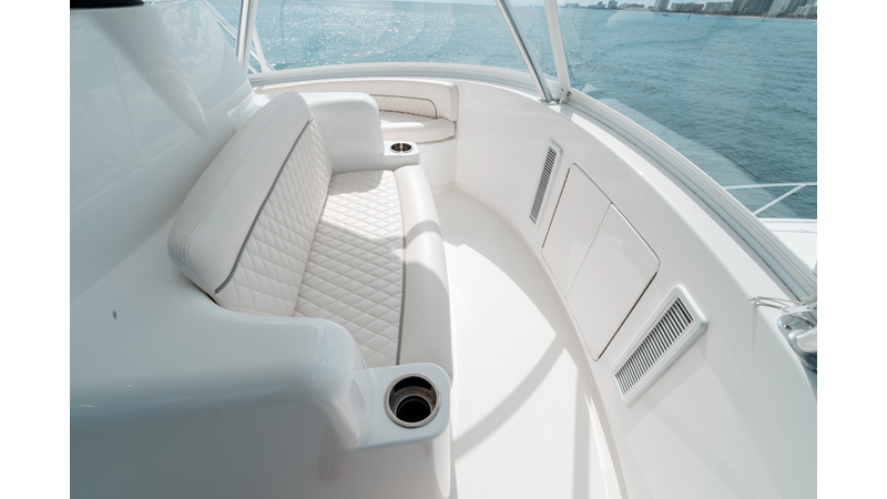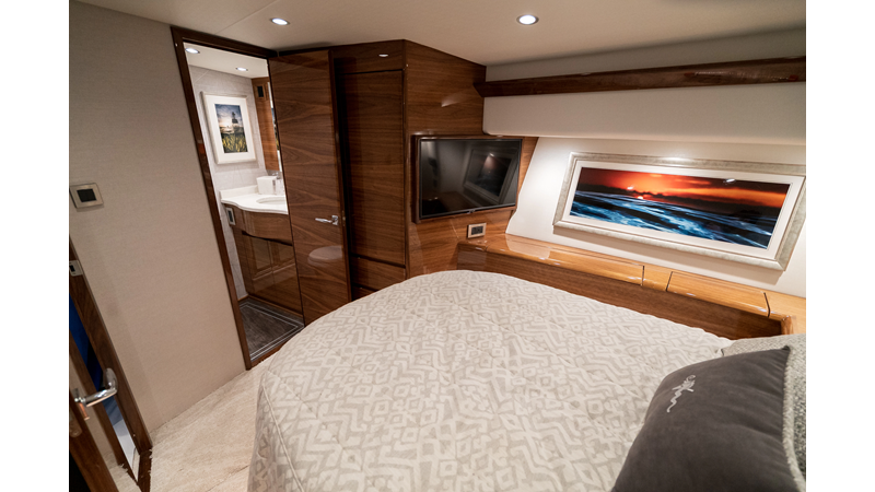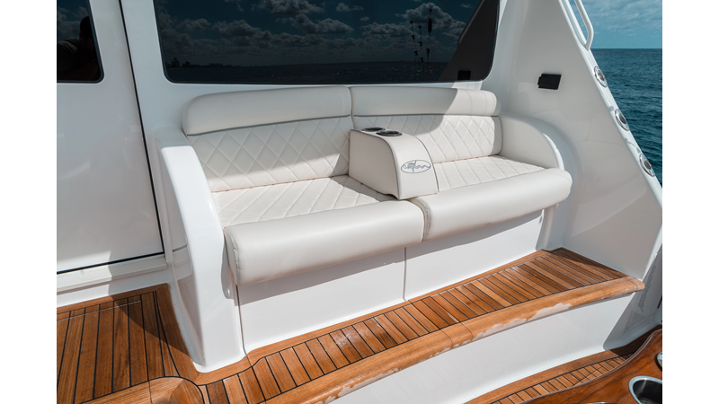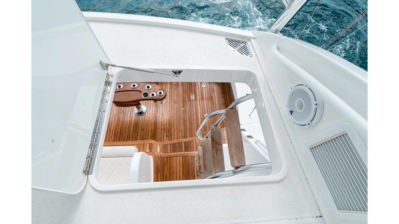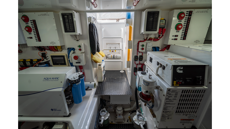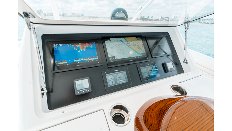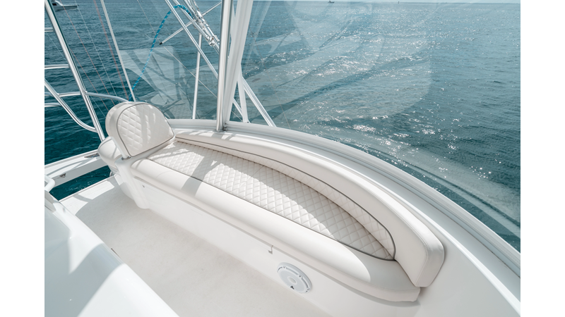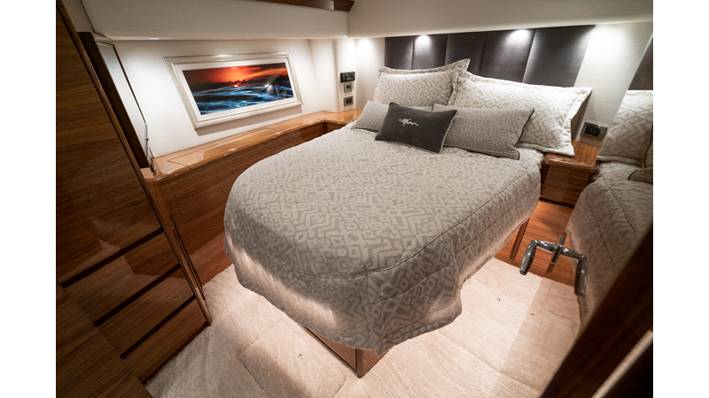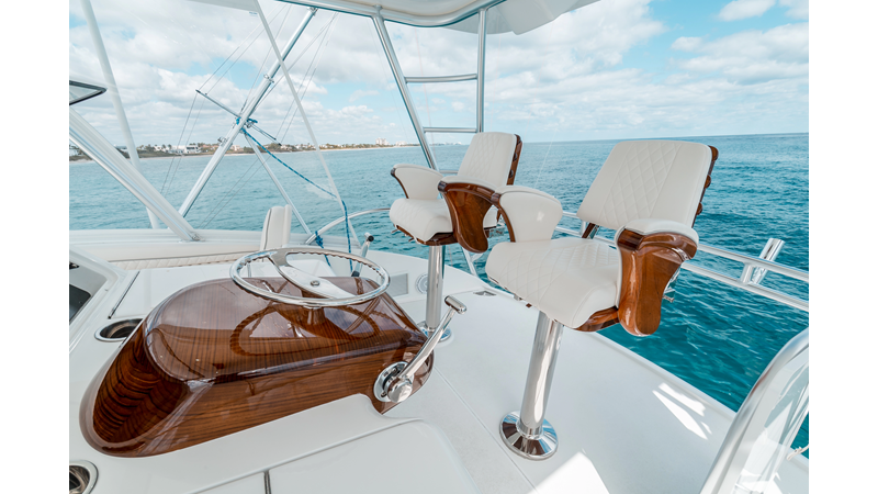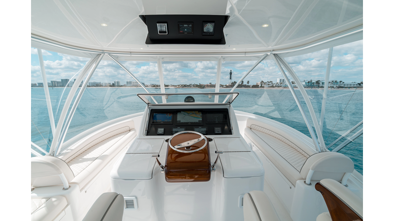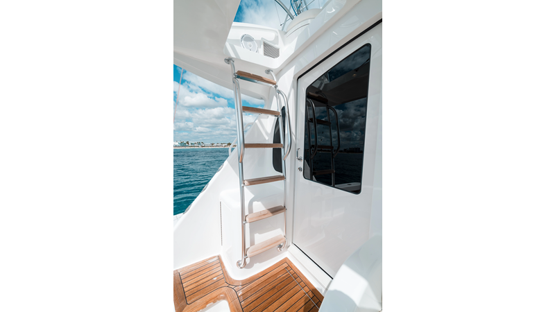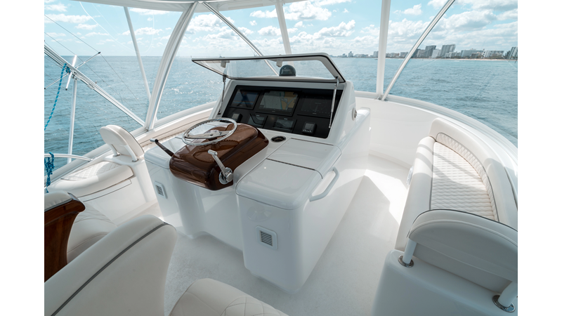 The model packs a lot in a very manageable size with a 3/2 layout, air conditioned flybridge, and great features for longer runs to fish the islands or canyons like a SeaRecovery Aquamatic Water Maker and Eskimo ice chipper.