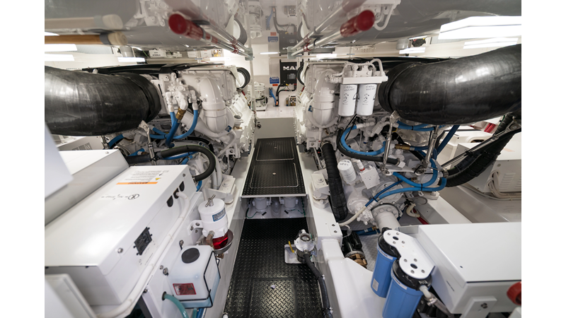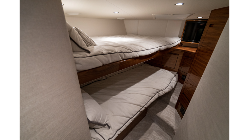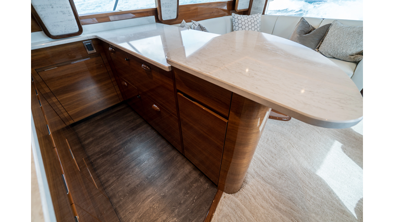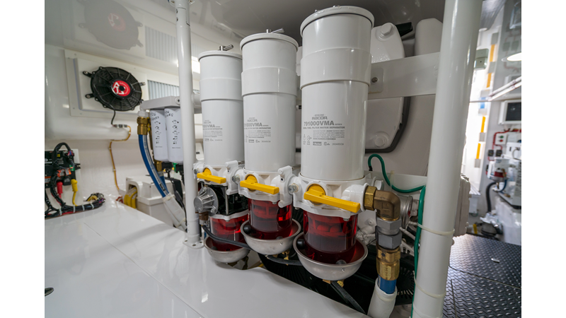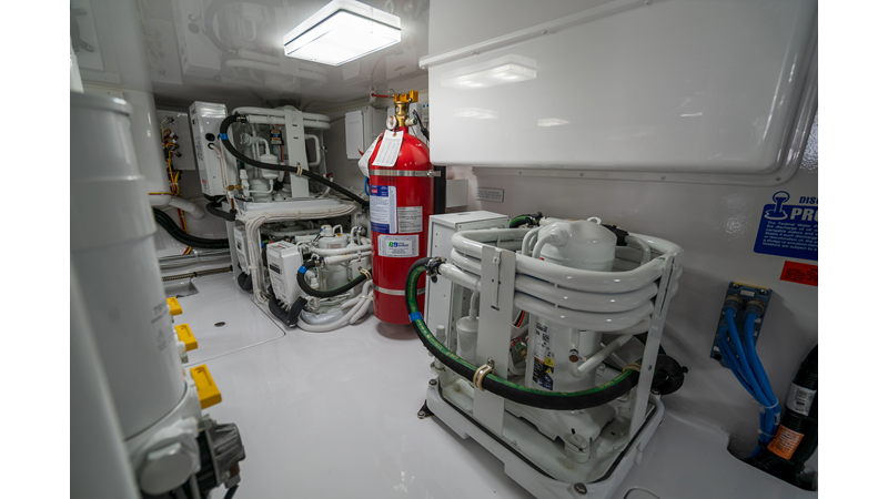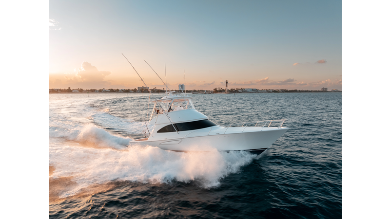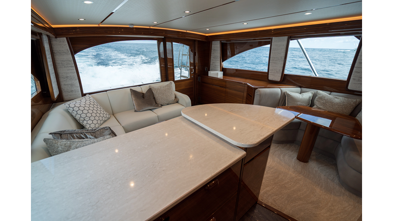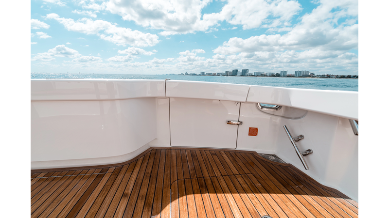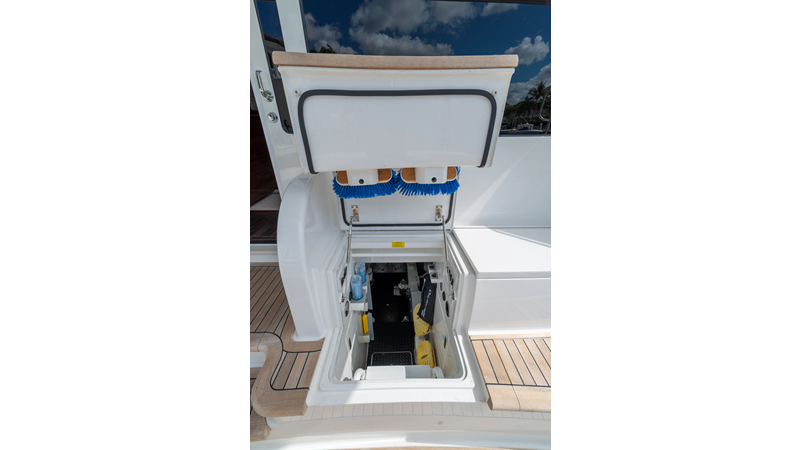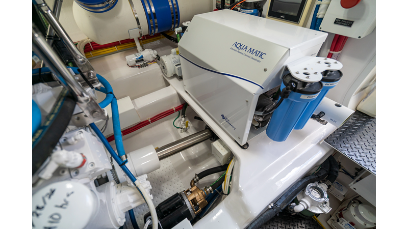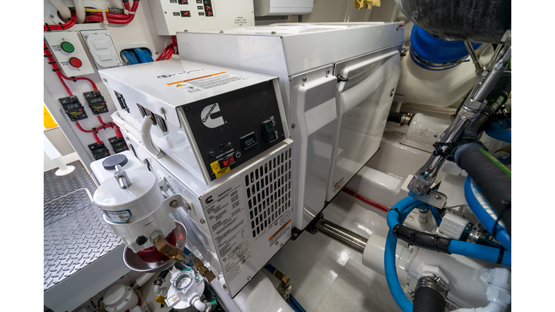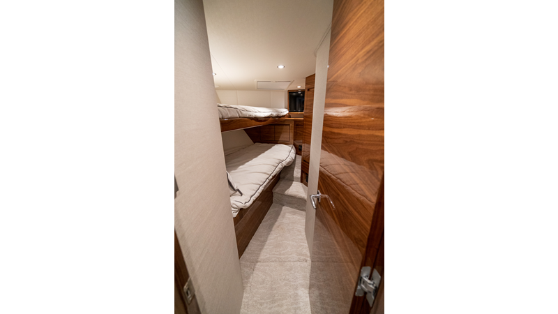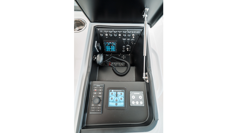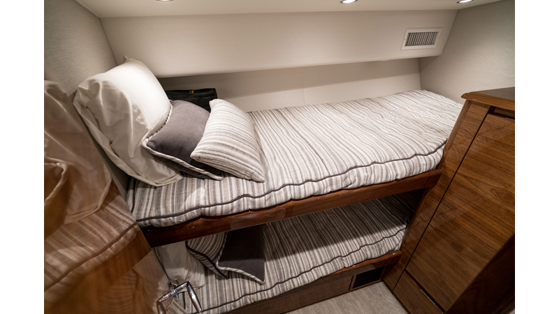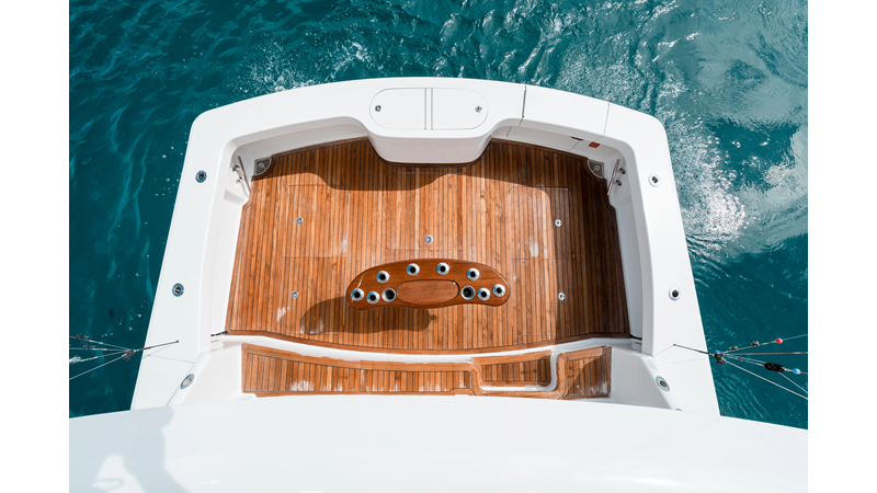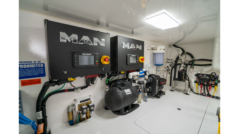 The model packs a lot in a very manageable size with a 3/2 layout, air conditioned flybridge, and great features for longer runs to fish the islands or canyons like a SeaRecovery Aquamatic Water Maker and Eskimo ice chipper.