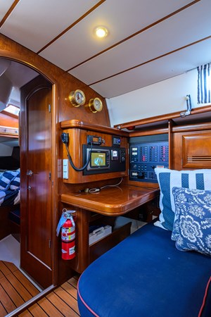 Below deck, the bright cherry wood interior includes a large owner’s cabin, two heads, and ample storage, perfect for extended stays. Equipped with in-mast furling sails, a spinnaker, and a complete safety inventory, WINDIGO is set up for offshore cruising.