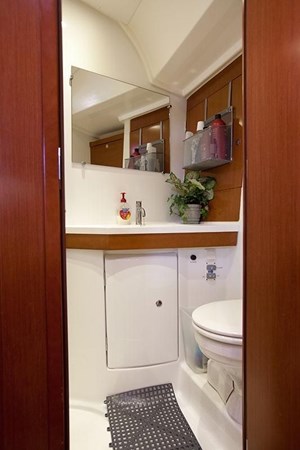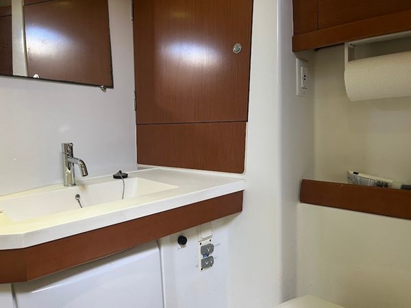Aft master cabin: The second stateroom is located in the aft section, featuring a queen-sized berth positioned laterally. It has its own private head with a separate shower that has a second door, allowing it to be used as a day head.