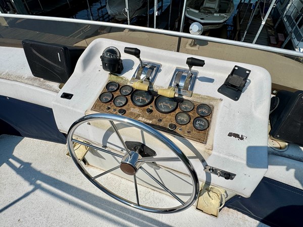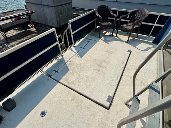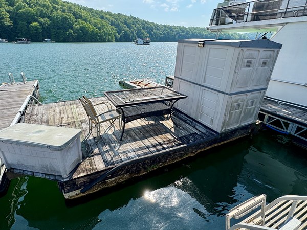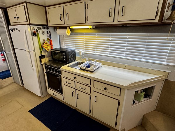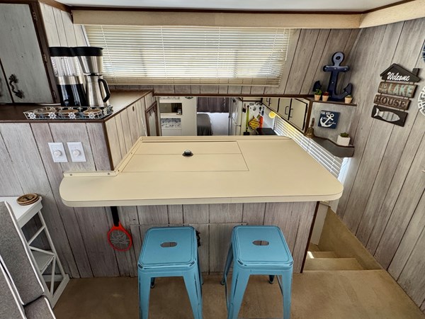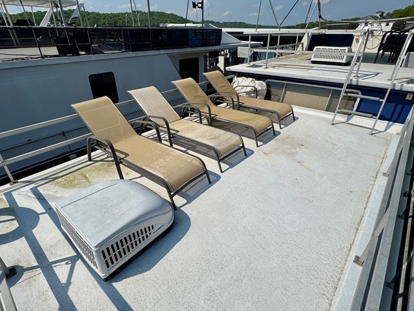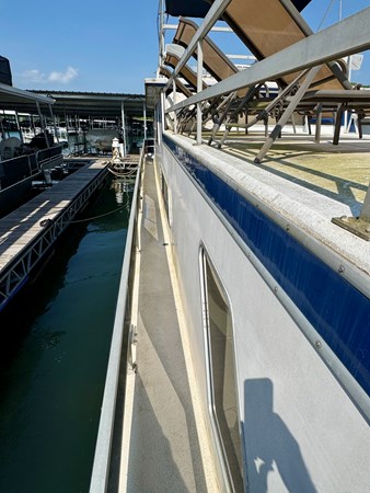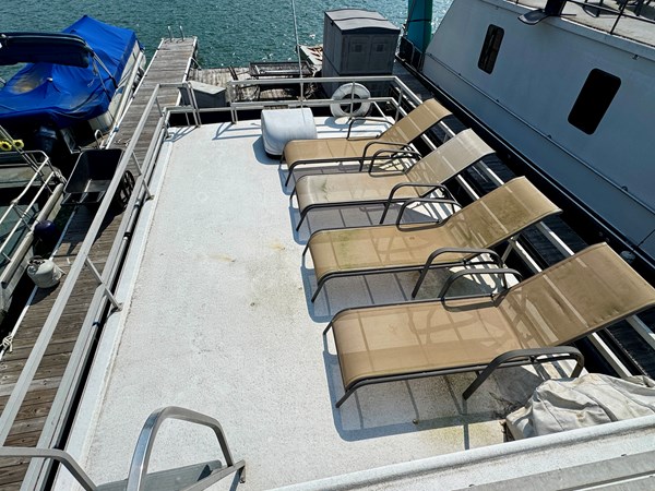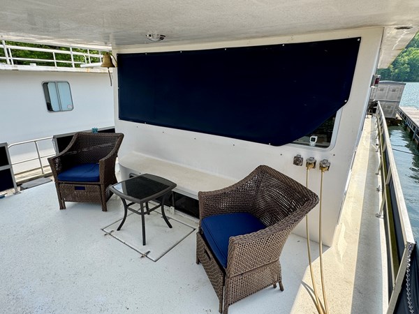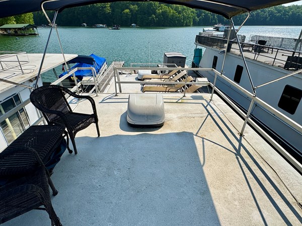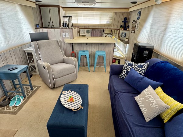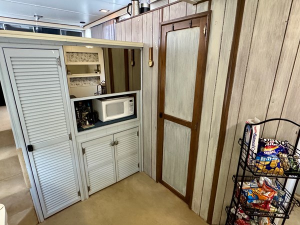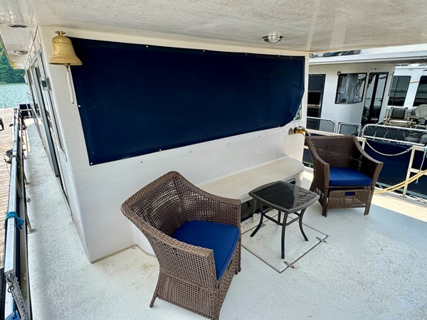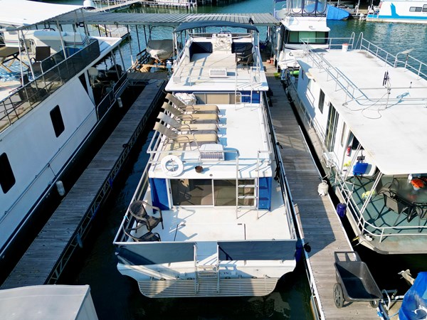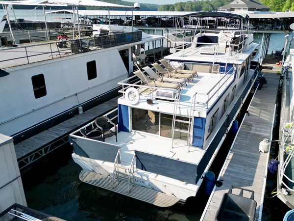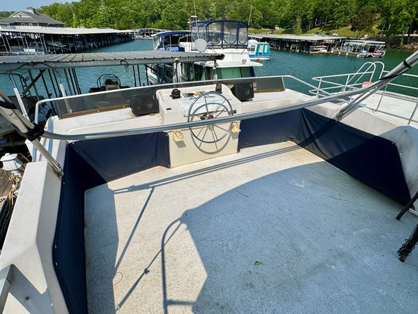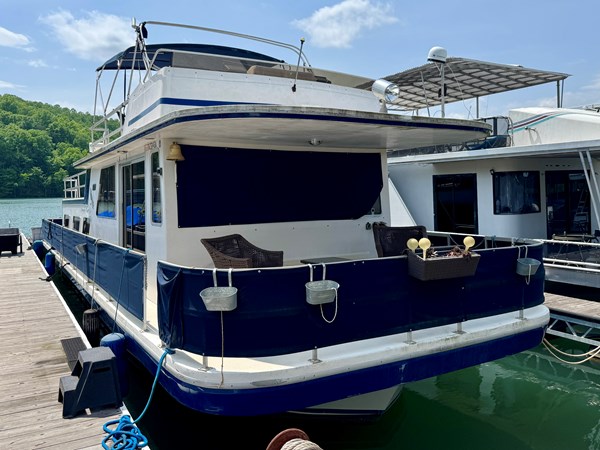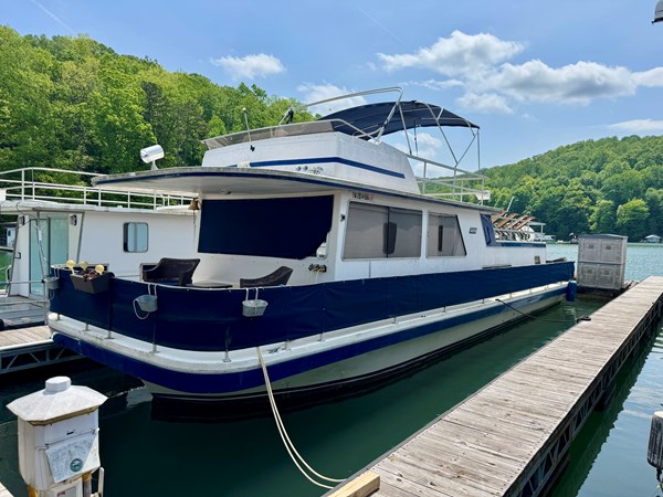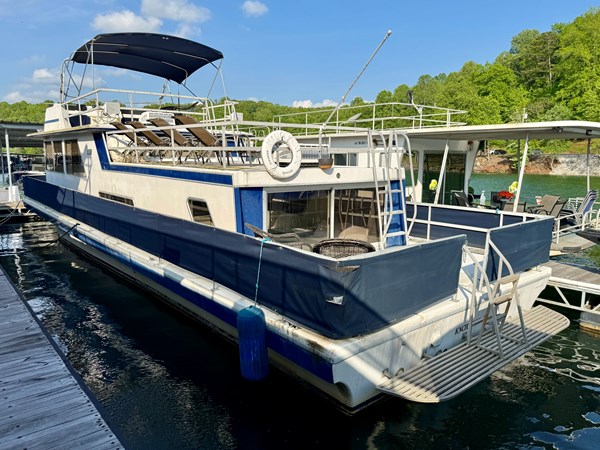 This 1987 Gibson 14 x 50 Standard Houseboat For Sale on Norris Lake Tennessee is equipped with twin counter-rotating 5.7L Crusader 350CID V8 Inboard V-Drive engines and an 8KW Westerbeke generator and features 2 staterooms with a queen master stateroom, double beds in a cuddy, a sleeper sofa, and 2 heads – one is a full bath with a shower/tub.