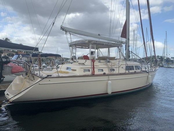 Built for voyaging, she features a center cockpit that becomes your all-weather sanctuary—high, dry, and with commanding views underway or at anchor. Her heavy-displacement hull and full-foil keel provide a steady, confident ride, while the cutter rig and 40% ballast-to-displacement ratio inspire trust in bluewater conditions. Offshore, she moves gracefully; electric winches, a bow thruster, and autopilot make passagemaking effortless for a couple or a short-handed crew. Her long waterline and balanced sail plan reward you with easy miles under sail, whether ghosting along in light breezes or charging through a fresh trade-wind swell.