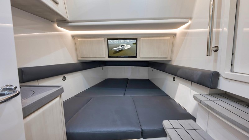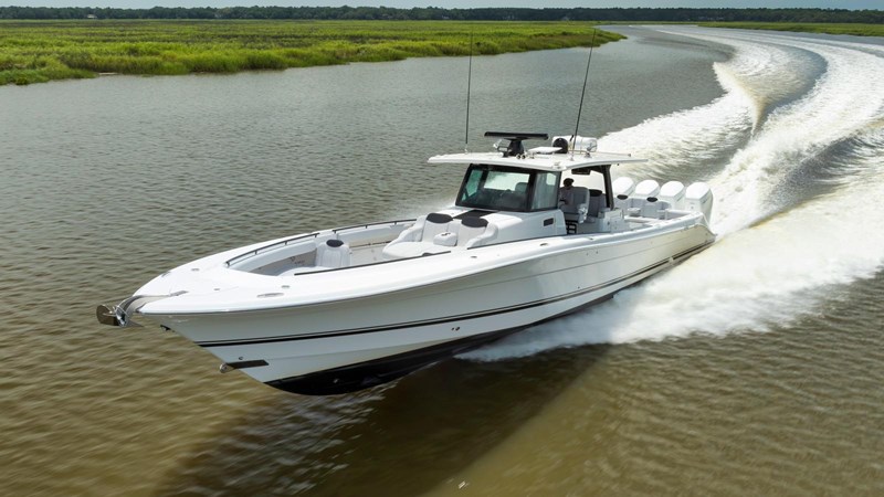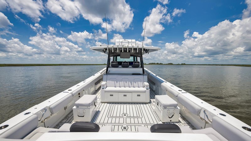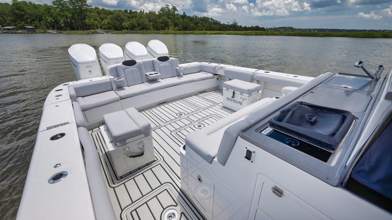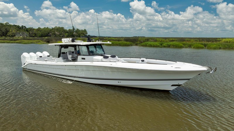 The 2021 53’ HCB Suenos, TRAVELLER has a sleek design that delivers luxury and comfort without sacrificing performance. Ideal for avid fishermen and boating enthusiasts alike, she features an ergonomic helm station with cutting-edge electronics, a climate-controlled cabin, and a well-appointed summer kitchen with a barbecue grill, making her perfect for entertaining. For fishing enthusiasts, TRAVELLER is tailored for the sport, including rod holders, two 60-gallon live wells, a deep freezer, and a spacious deck for maneuverability. Engineered for exceptional stability and speed, the Suenos is equipped with a Sea Keeper 6 stabilization system and has been recently repowered with quad Mercury 600hp outboard engines (under warranty through June 2027), ensuring a seamless and exhilarating experience.