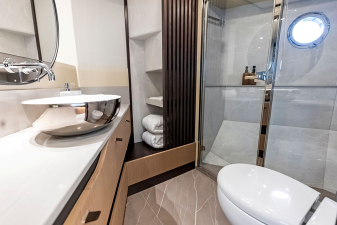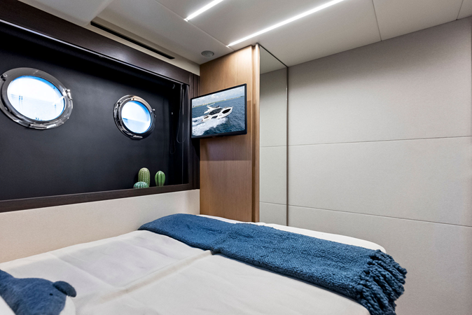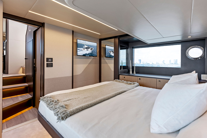 Inside, the salon features large panoramic windows, a fully equipped galley, and contemporary finishes that enhance natural light and openness. Below deck, the layout includes a full-beam master cabin, a generous VIP cabin, and a versatile third guest cabin, offering comfortable accommodations for extended cruising. A separate crew cabin is accessed from the swim platform.