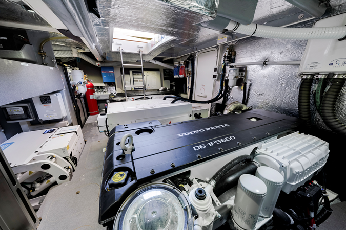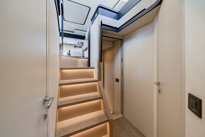The main salon of the Navetta 53, with its 360-degree panoramic view, envelops guests in an embrace of light and space. The elegant environment features carefully curated furnishings and a well-equipped kitchen, seamlessly integrated with the cockpit. The modern and ergonomic command post offers a high level of technology and a convenient side door for autonomous maneuvers. The full-beam master cabin, located amidships, features large windows, a queen-size bed, and ample storage options. The forward VIP cabin and the third central cabin, both generously illuminated by natural light, reflect the same attention to comfort and design, ensuring a pleasant and luxurious stay. Thanks to the Volvo Penta IPS propulsion, the Navetta 53 offers exceptional performance and reduced fuel consumption, ensuring a superior sailing experience.