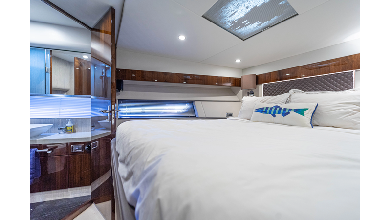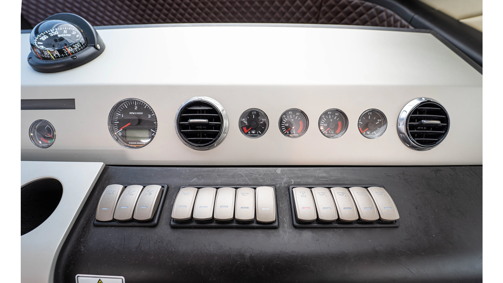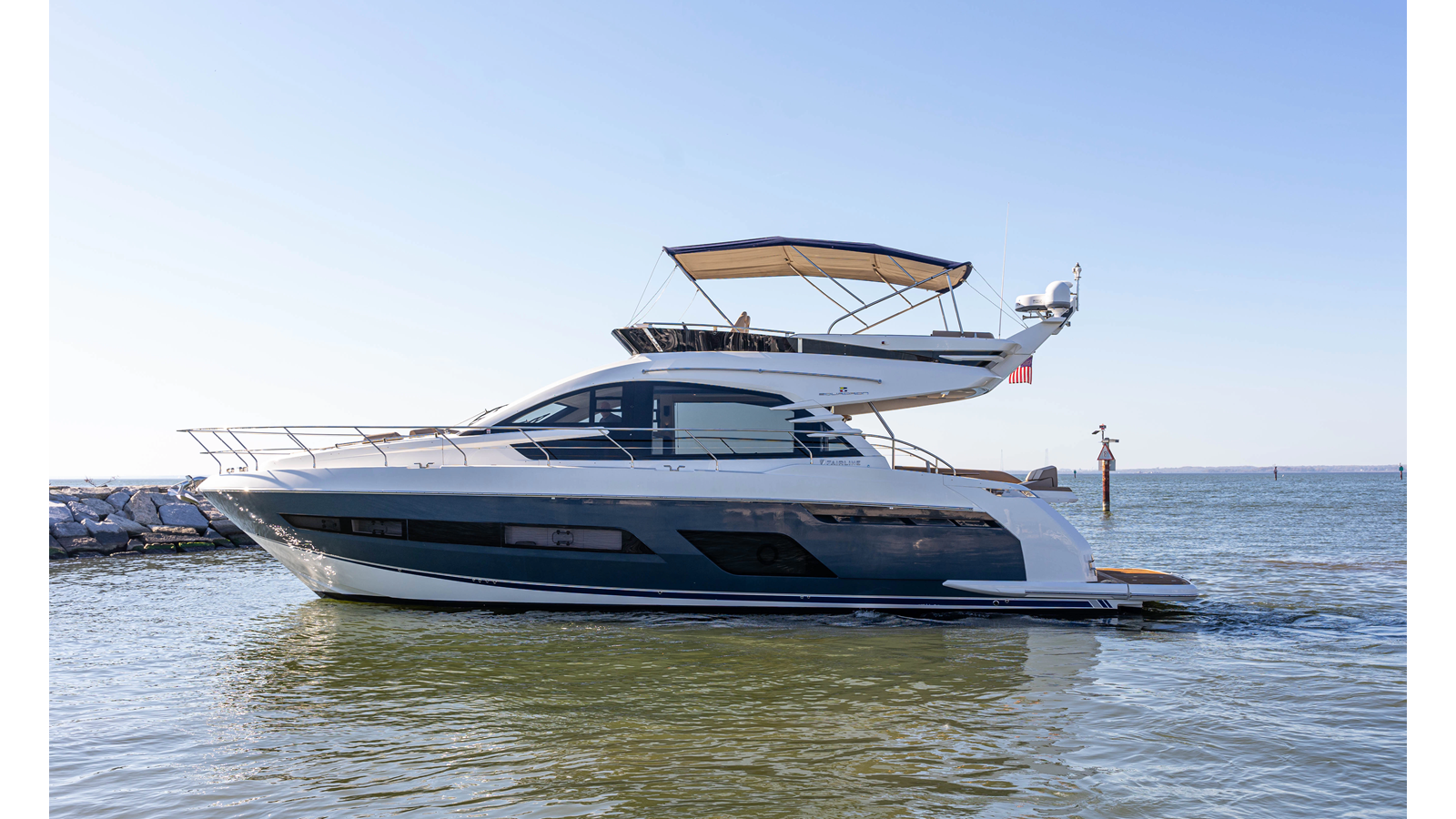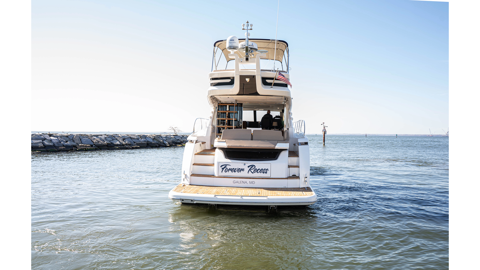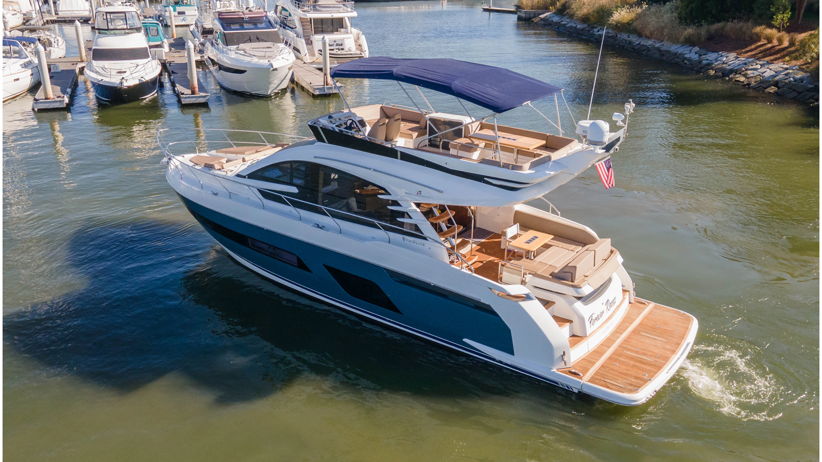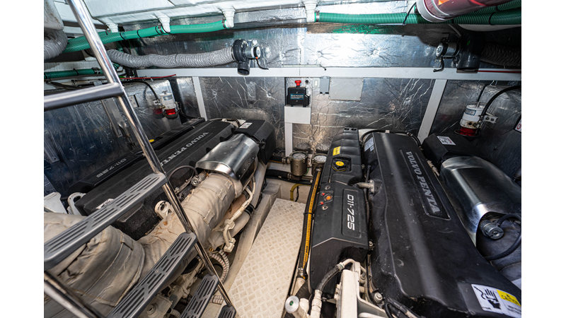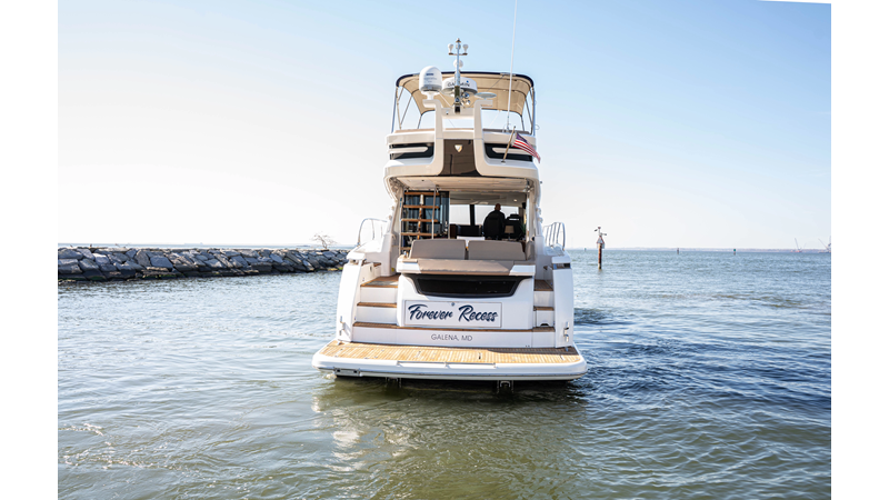 This 53 has the galley up, three cabin, two head floorplan. She has a raked-back flybridge and large aft cockpit. She has been kept in a covered slip in brackish water (70% fresh) since 2019 on the upper Chesapeake Bay of Maryland. Maintained with an open checkbook with mains being recently serviced as well as 1000 service already performed at 965 hours. Super sporty looking and fast with her shaft drive Volvo 725’s she cruises comfortably at 25 and tops out at 32 knots.