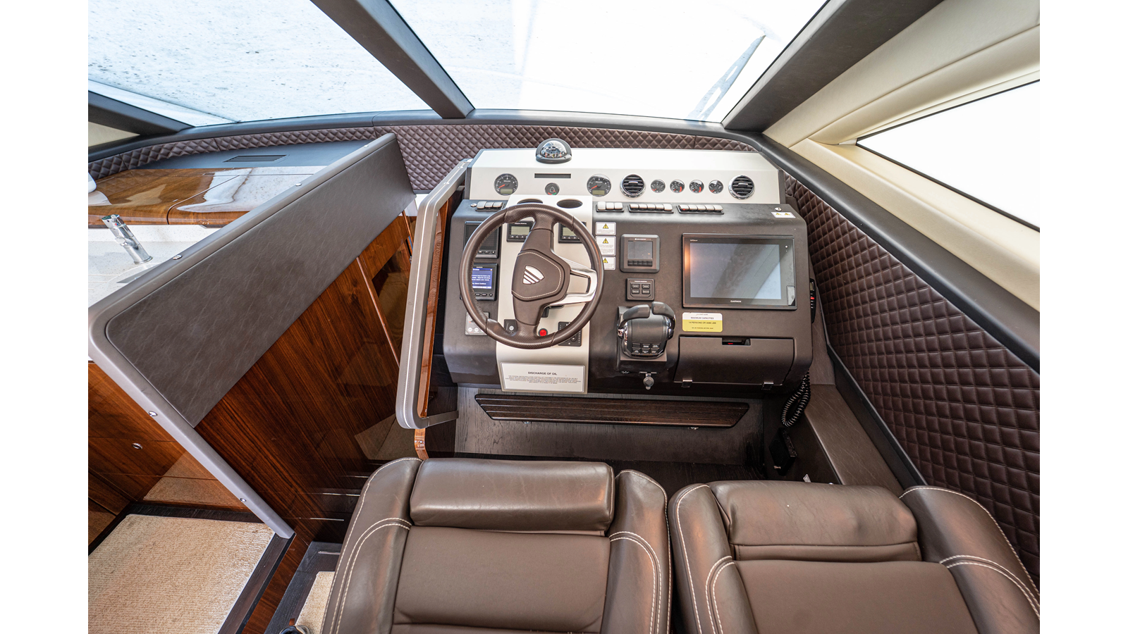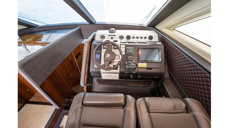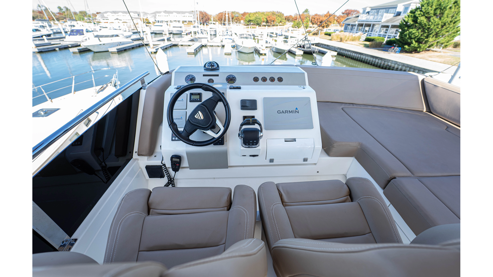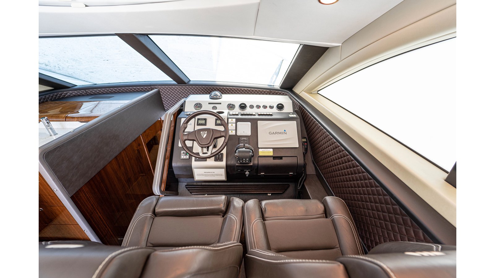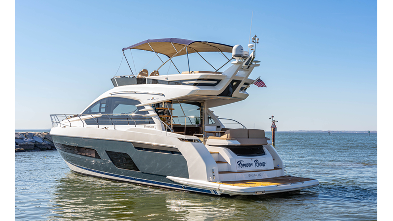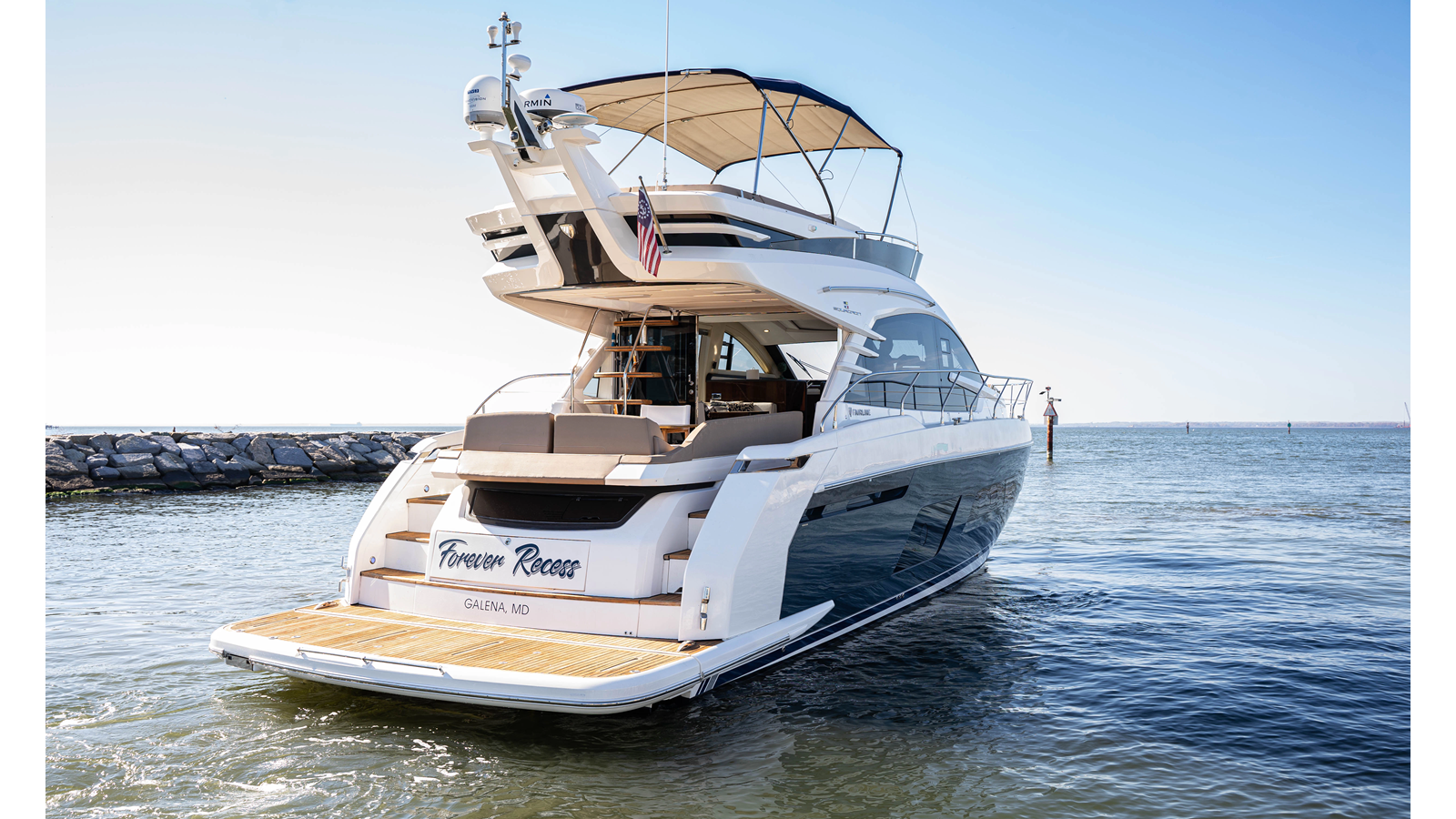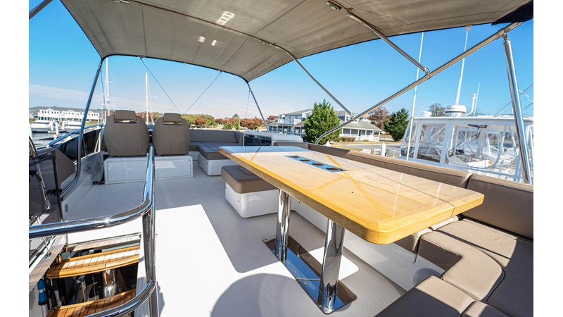 This 53 has the galley up, three cabin, two head floorplan. She has a raked-back flybridge and large aft cockpit. She has been kept in a covered slip in brackish water (70% fresh) since 2019 on the upper Chesapeake Bay of Maryland. Maintained with an open checkbook with mains being recently serviced as well as 1000 service already performed at 965 hours. Super sporty looking and fast with her shaft drive Volvo 725’s she cruises comfortably at 25 and tops out at 32 knots.