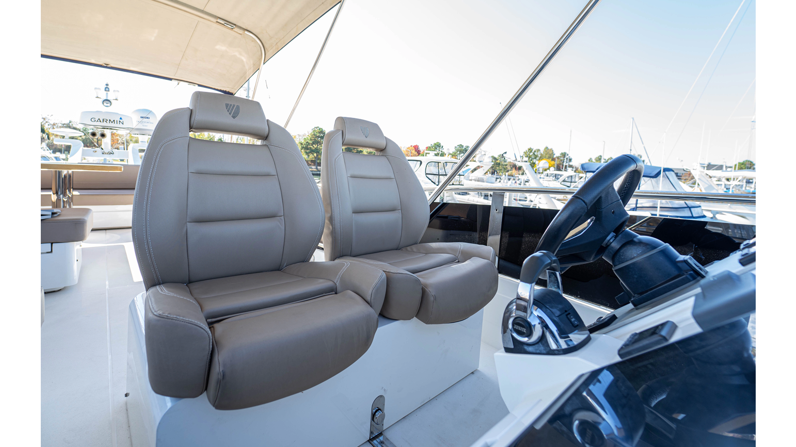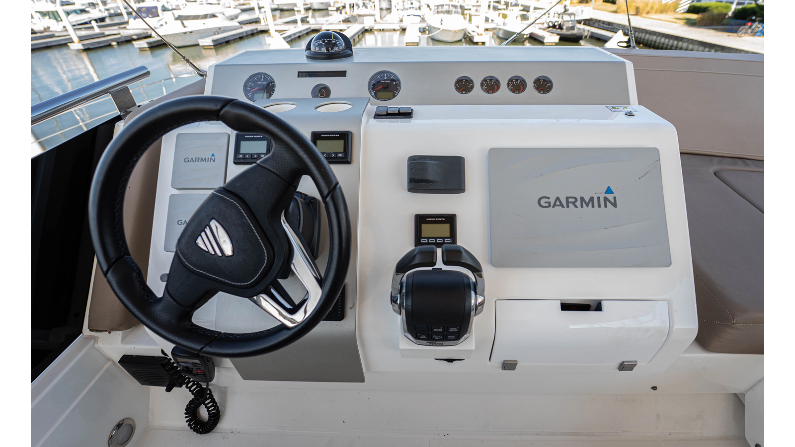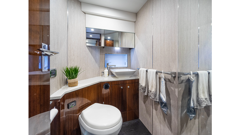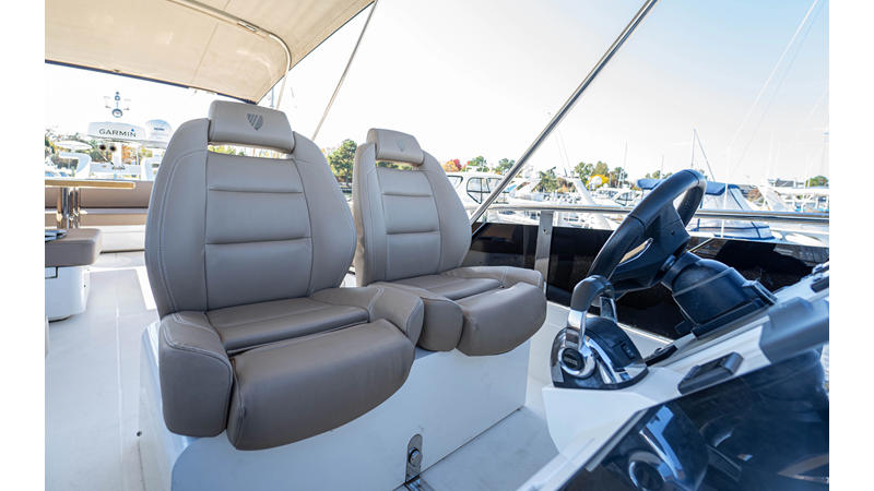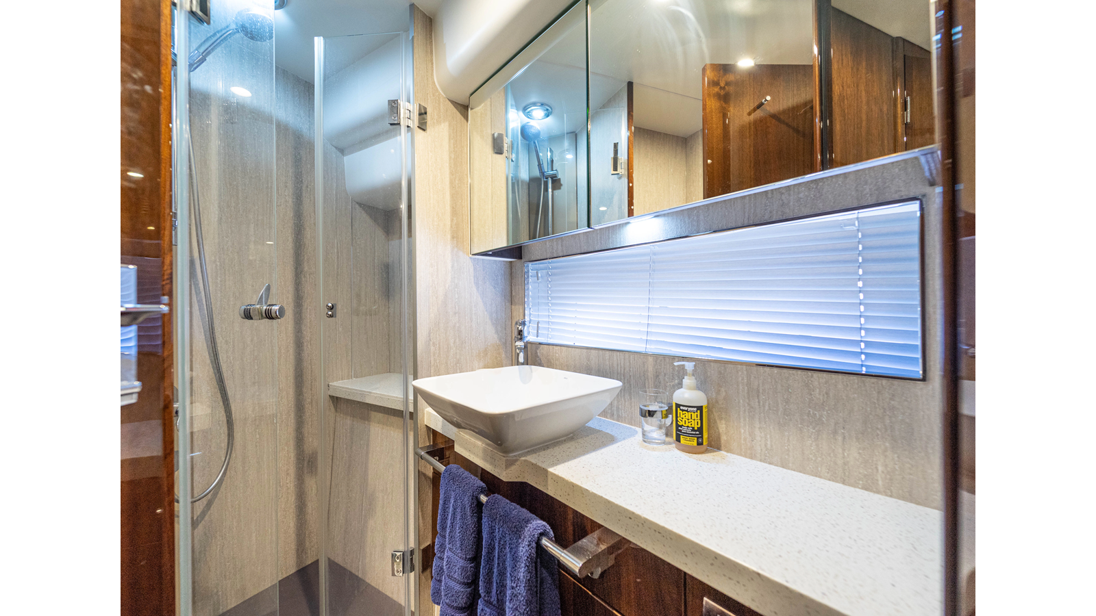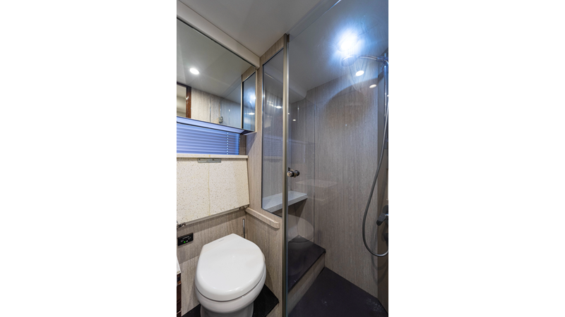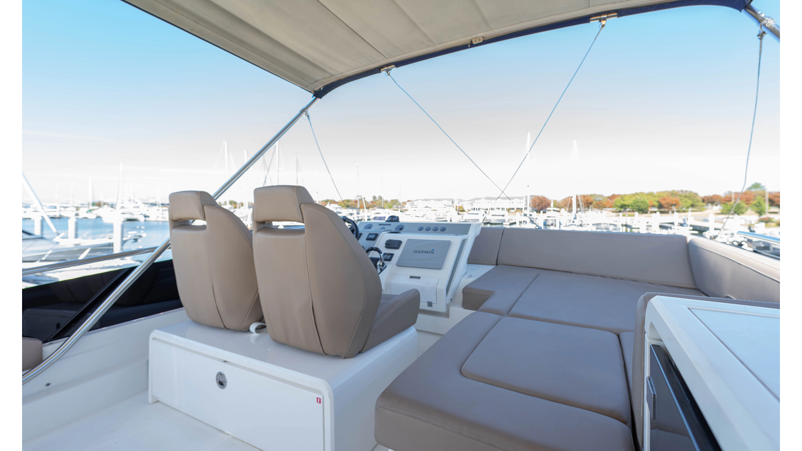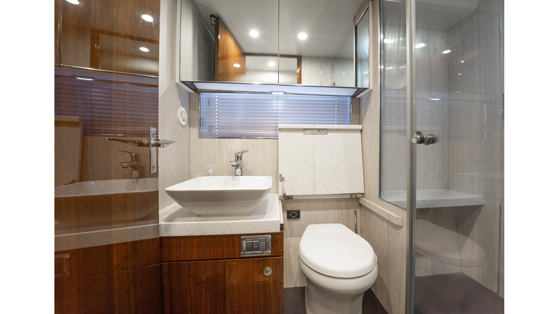 This 53 has the galley up, three cabin, two head floorplan. She has a raked-back flybridge and large aft cockpit. She has been kept in a covered slip in brackish water (70% fresh) since 2019 on the upper Chesapeake Bay of Maryland. Maintained with an open checkbook with mains being recently serviced as well as 1000 service already performed at 965 hours. Super sporty looking and fast with her shaft drive Volvo 725’s she cruises comfortably at 25 and tops out at 32 knots.