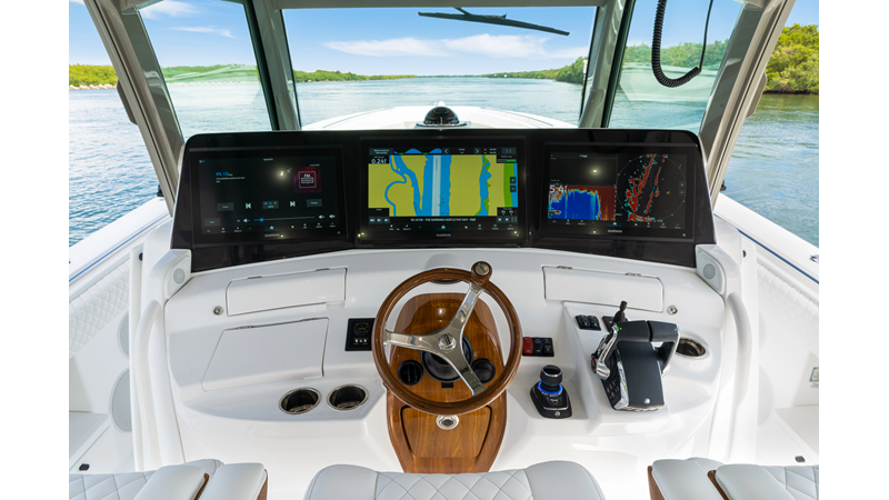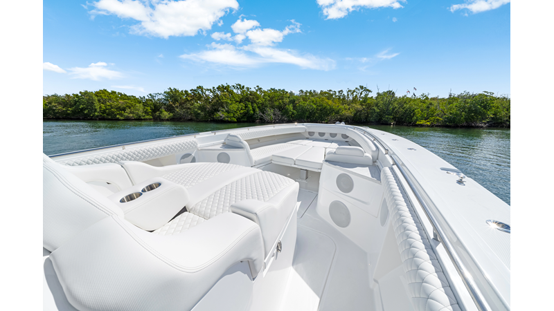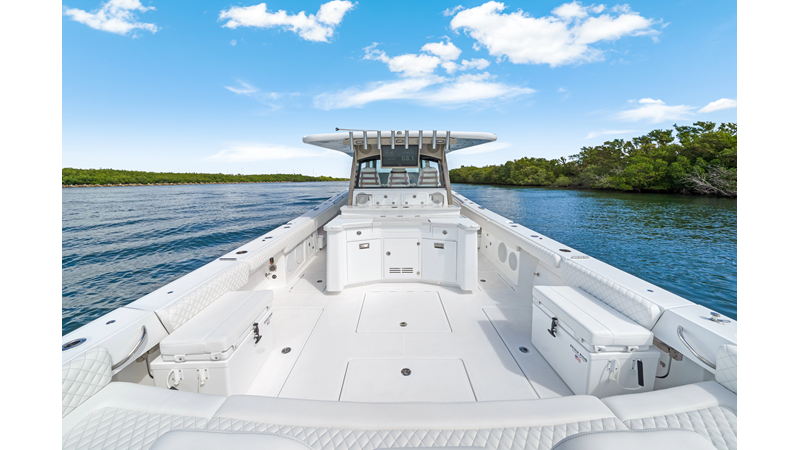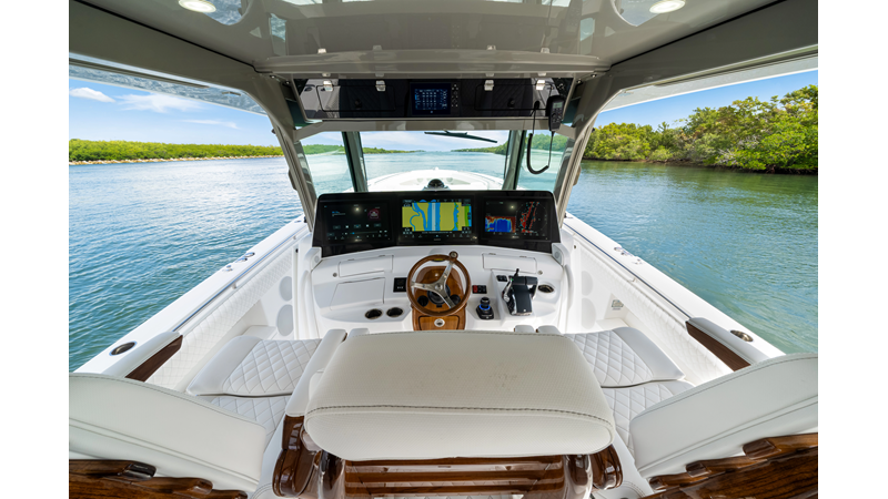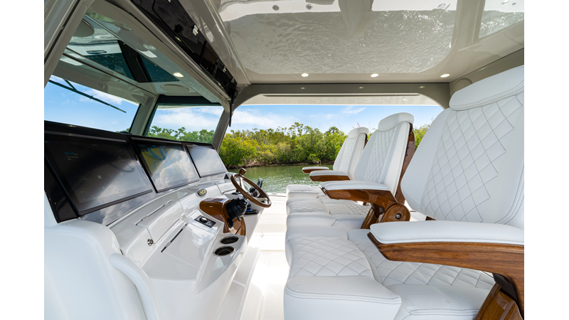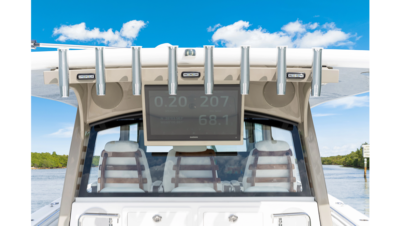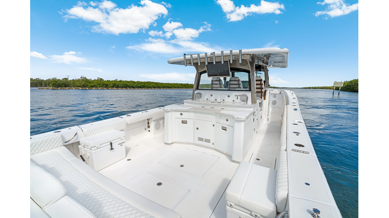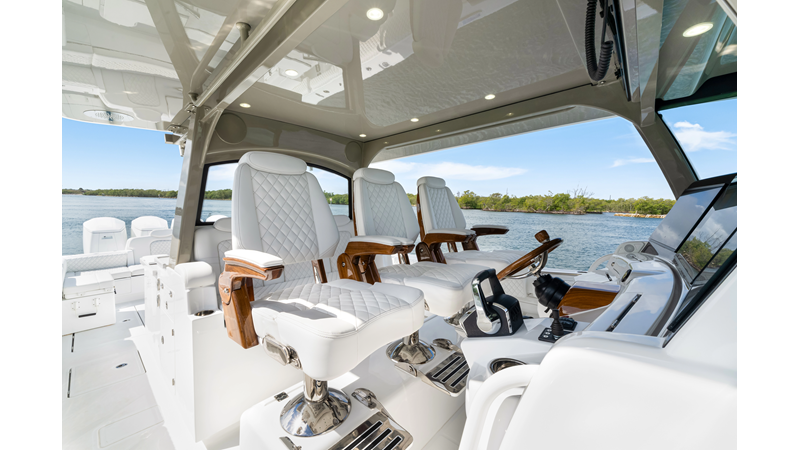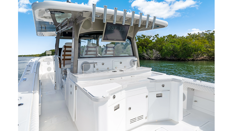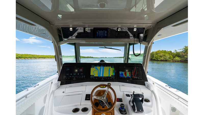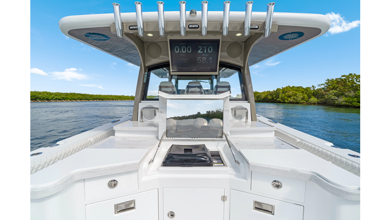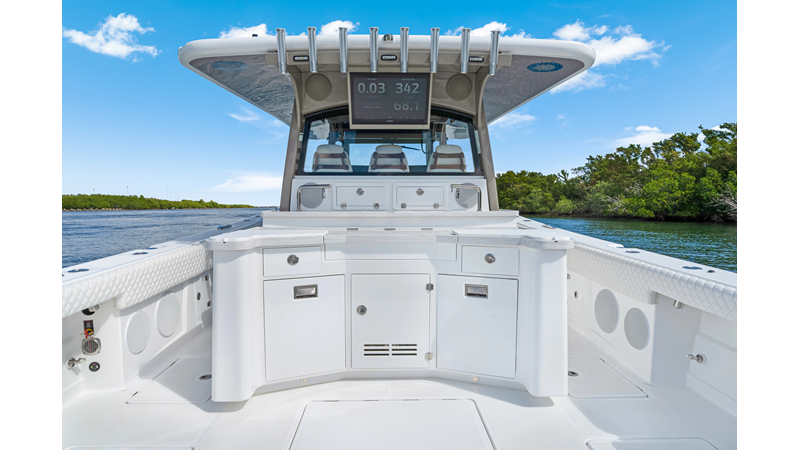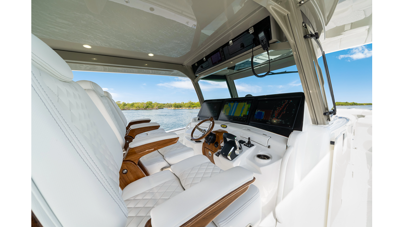 • Expansive cockpit and luxury helm seating with premium upholstery • Garmin 24" multi-function displays with integrated radar and sonar • Custom hardtop with recessed lighting and integrated shade • Seakeeper 6 stabilization for unmatched comfort in any sea state • Westerbeke 7.6 kW generator with water-separated exhaust • JL Audio premium sound system for a concert-quality experience • Refrigerated fish boxes, large livewells, and abundant rod-holder upgrades for serious offshore fishing