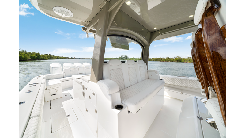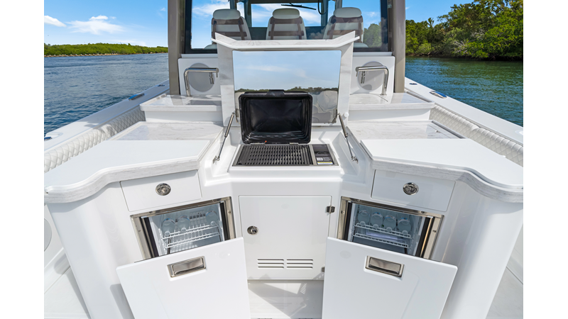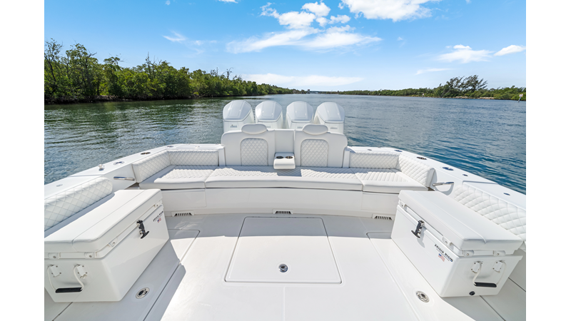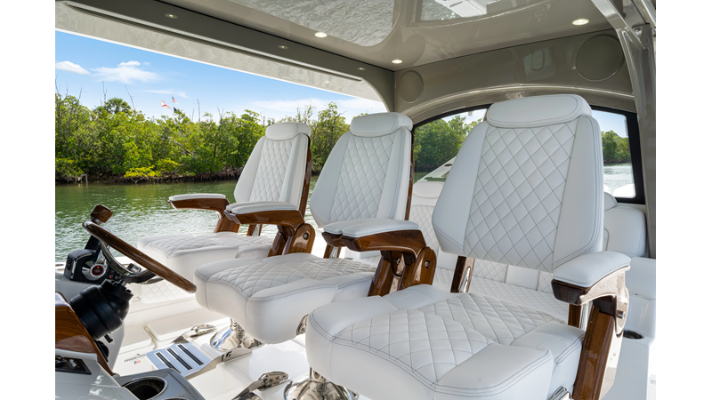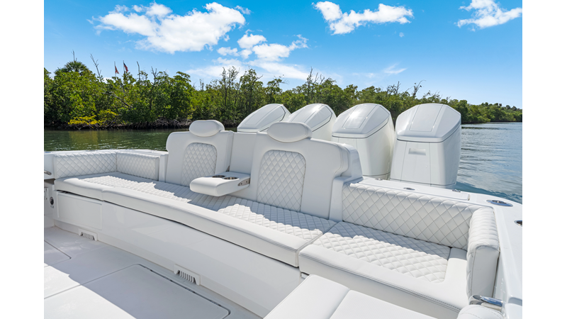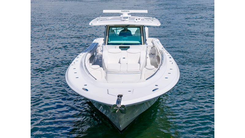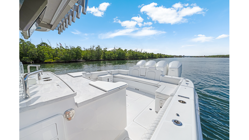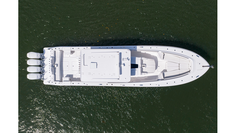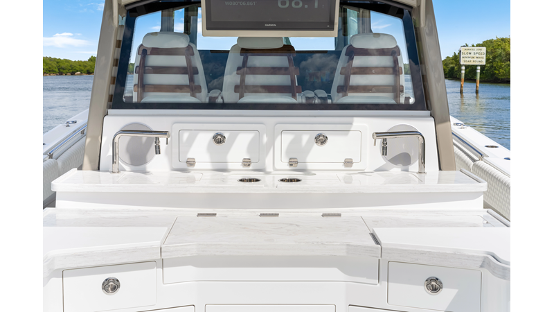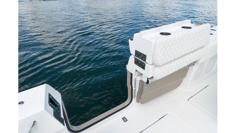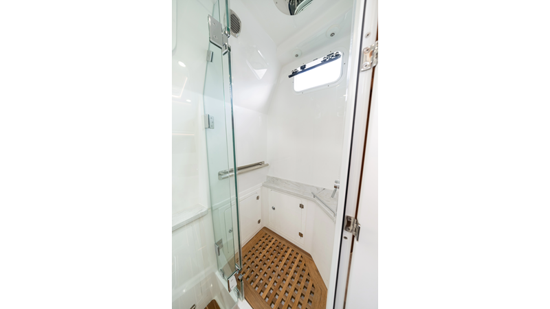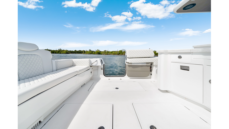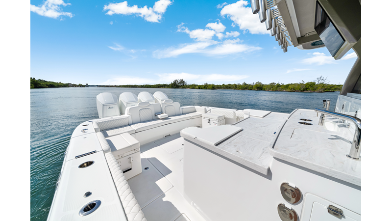• Expansive cockpit and luxury helm seating with premium upholstery • Garmin 24" multi-function displays with integrated radar and sonar • Custom hardtop with recessed lighting and integrated shade • Seakeeper 6 stabilization for unmatched comfort in any sea state • Westerbeke 7.6 kW generator with water-separated exhaust • JL Audio premium sound system for a concert-quality experience • Refrigerated fish boxes, large livewells, and abundant rod-holder upgrades for serious offshore fishing
