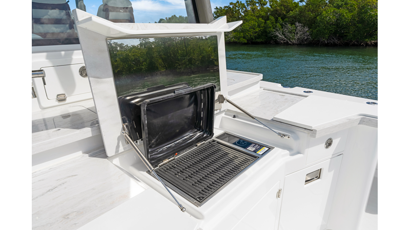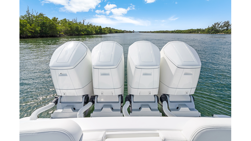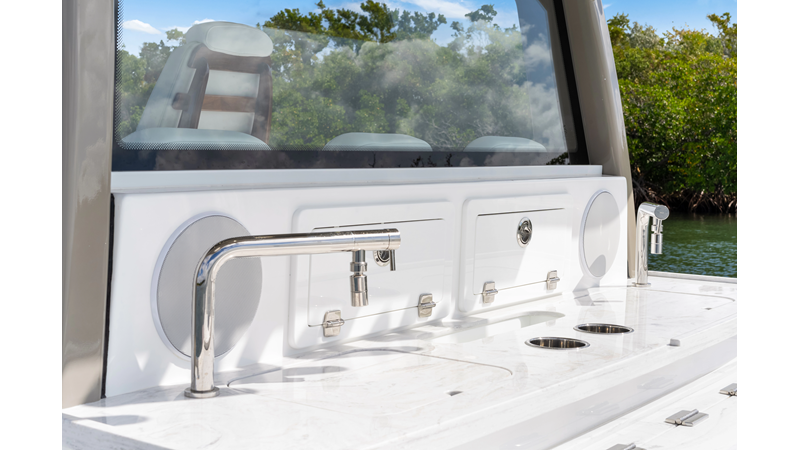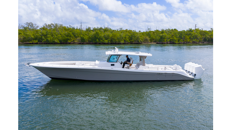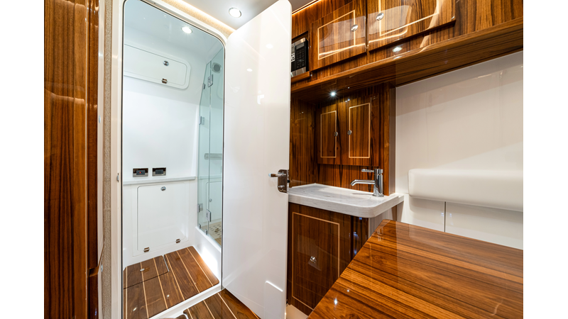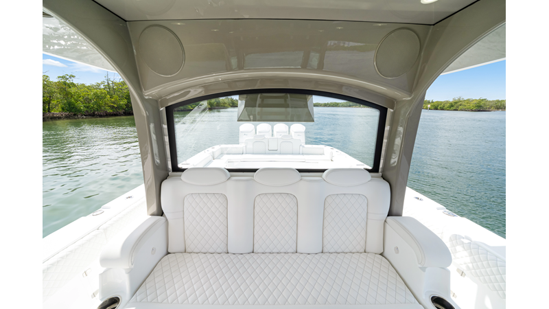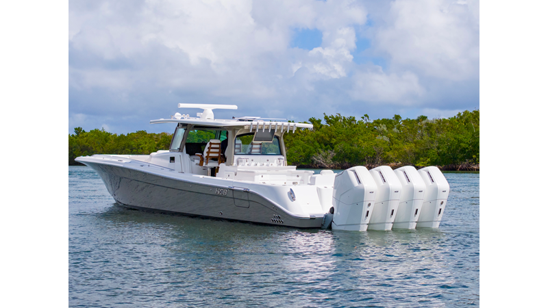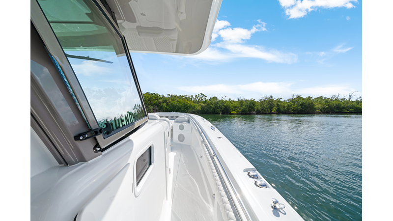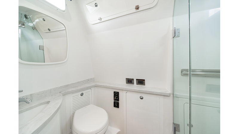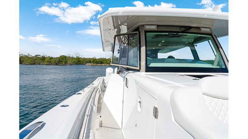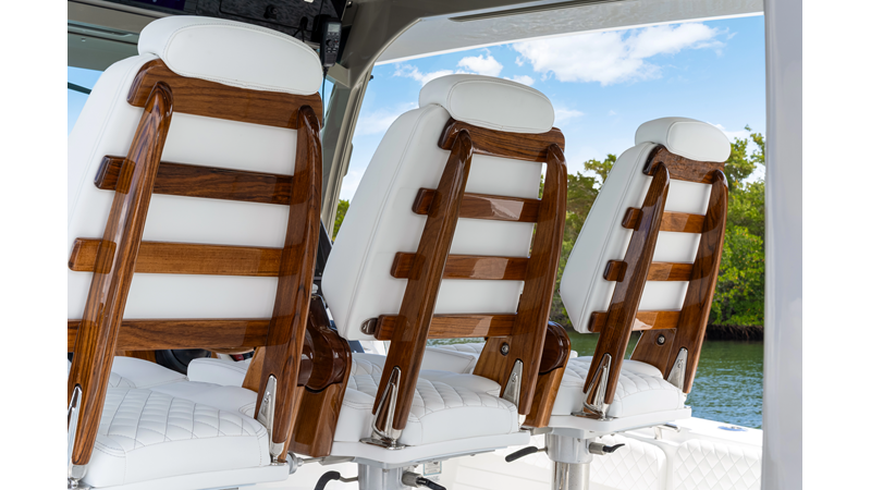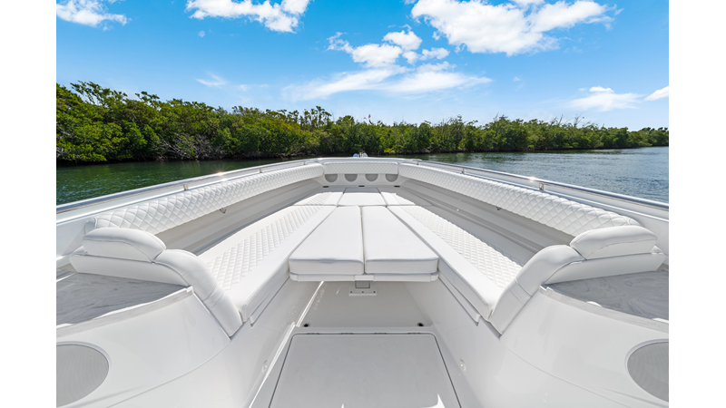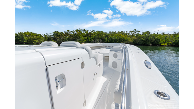 • Expansive cockpit and luxury helm seating with premium upholstery • Garmin 24" multi-function displays with integrated radar and sonar • Custom hardtop with recessed lighting and integrated shade • Seakeeper 6 stabilization for unmatched comfort in any sea state • Westerbeke 7.6 kW generator with water-separated exhaust • JL Audio premium sound system for a concert-quality experience • Refrigerated fish boxes, large livewells, and abundant rod-holder upgrades for serious offshore fishing