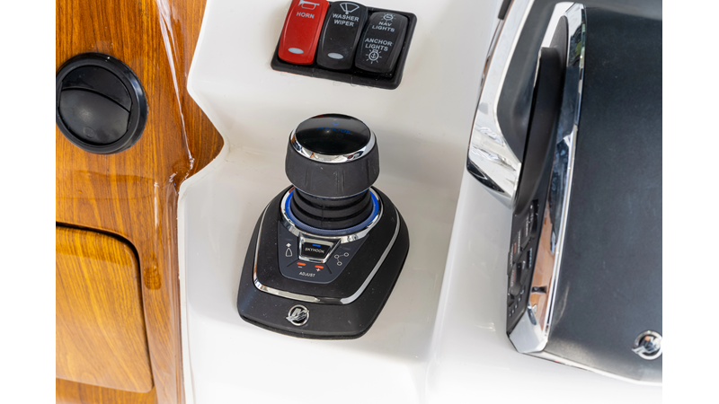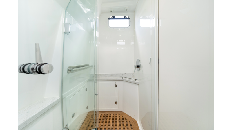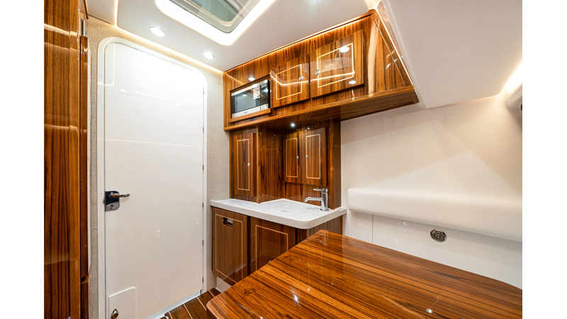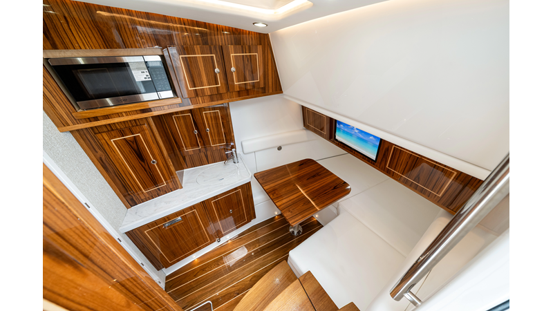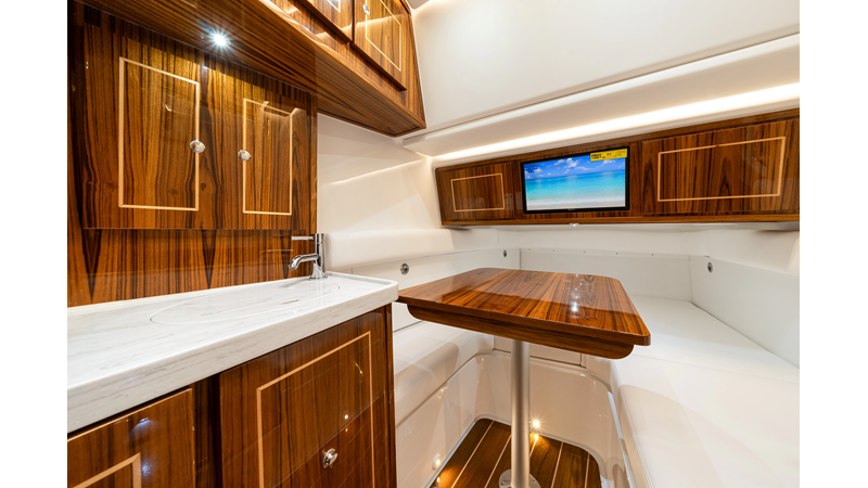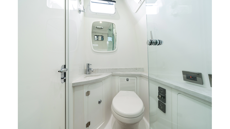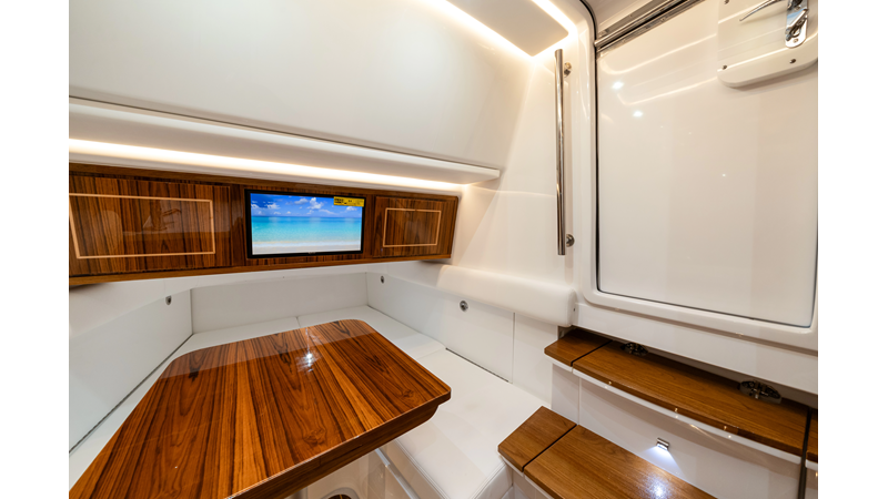 The bow area is dual purpose with seating to accommodate guests on the forward-facing lounger or around bow seats and table that convert to a large sun pad for lazy days catching rays; or remove the cushions for a fully functional fishing platform. The luxuriously functional cabin with queen sized berth, storage galore, galley kitchen, and separate head/shower compartment is the perfect place for air-conditioned comfort on hot days as well as longer trips with overnight stays.