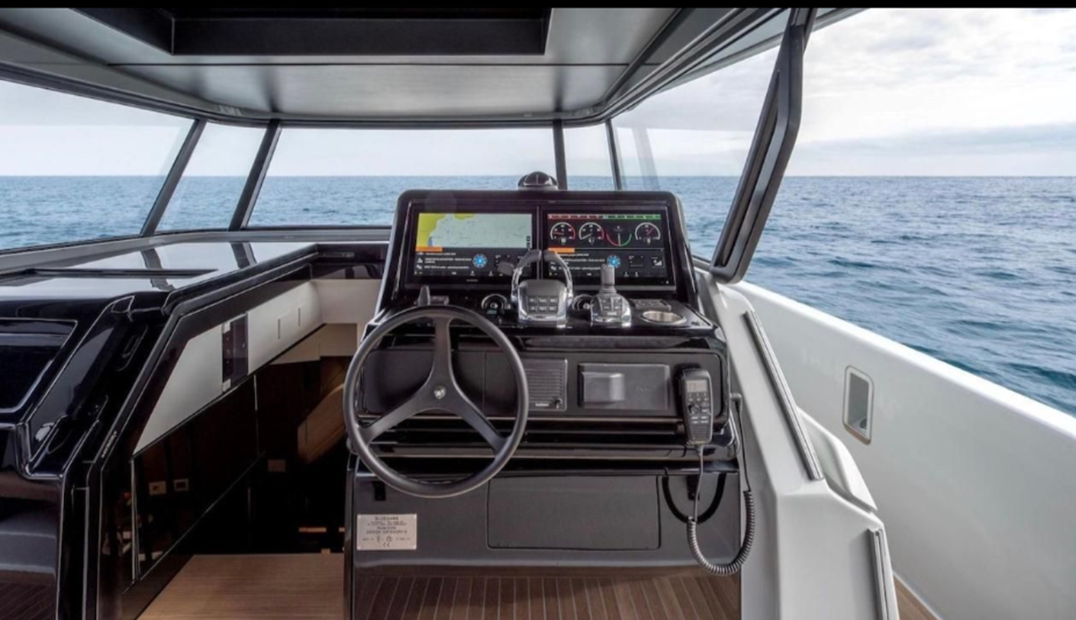 Built in GRP, the boat has simple, clean exterior lines. The white hull has a wraparound black rubber fender, an open stern and strongly slanted bridge glass that combine to give it a purposeful, no-nonsense look.