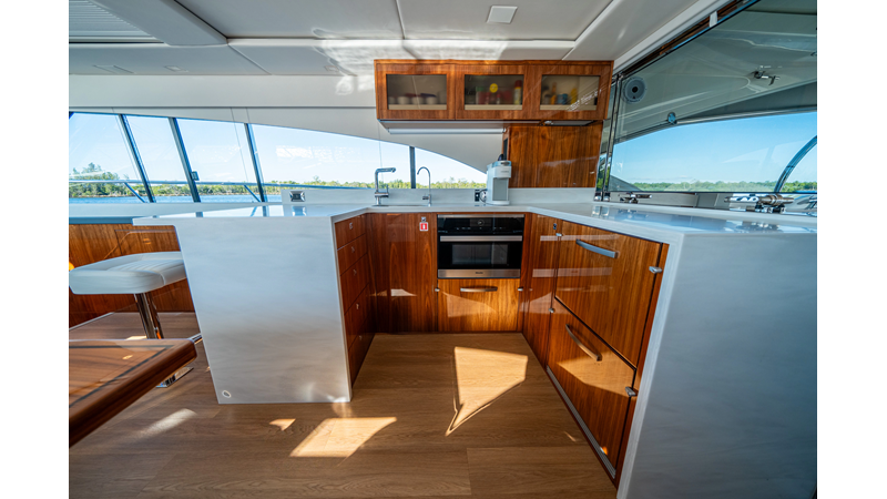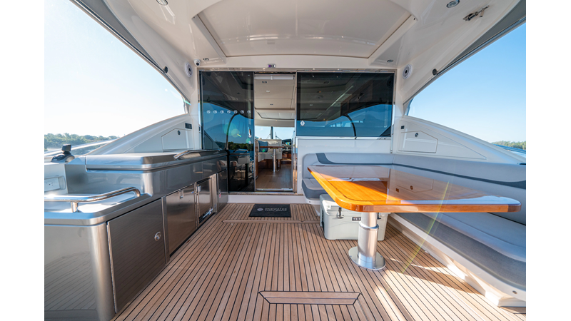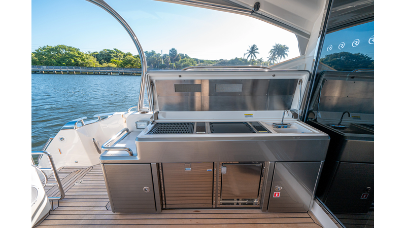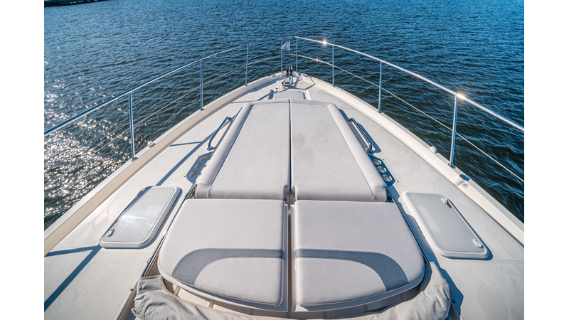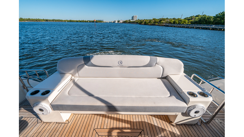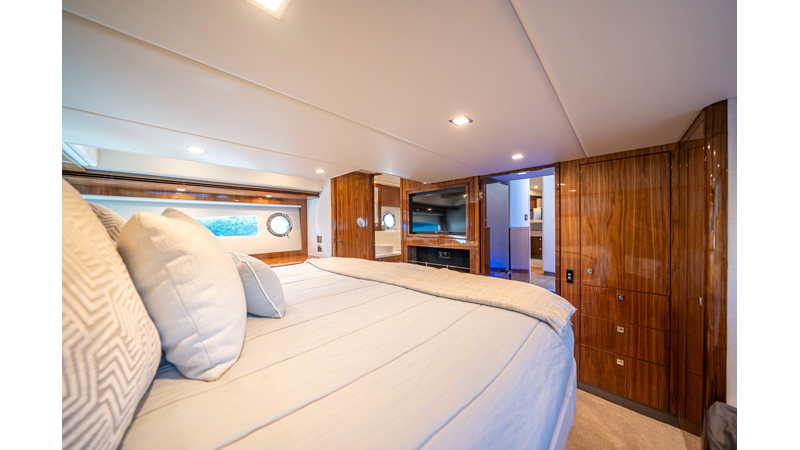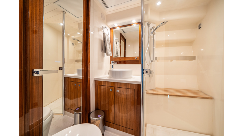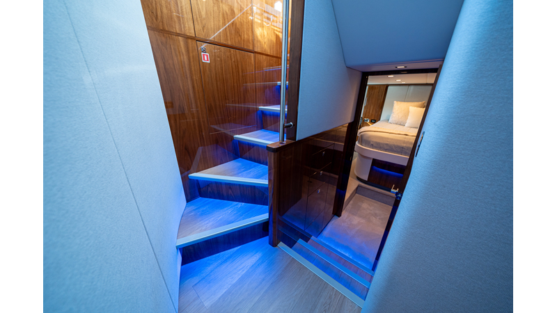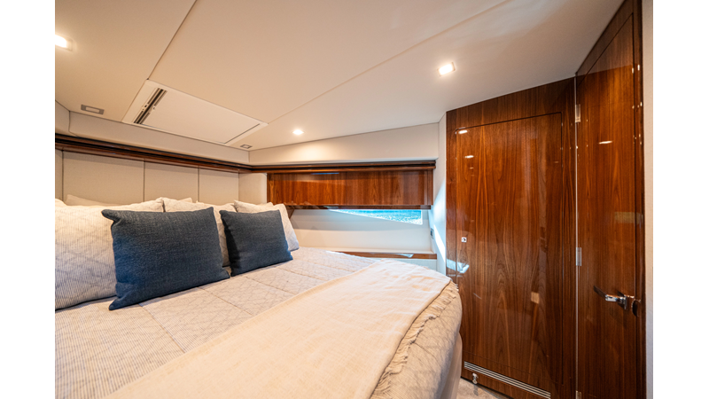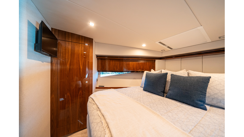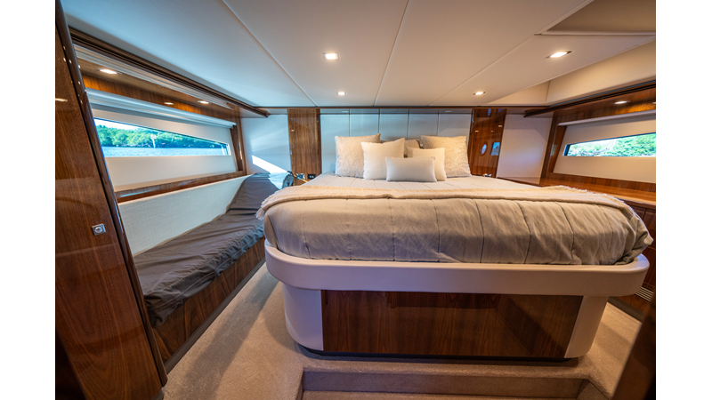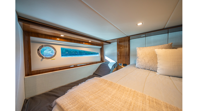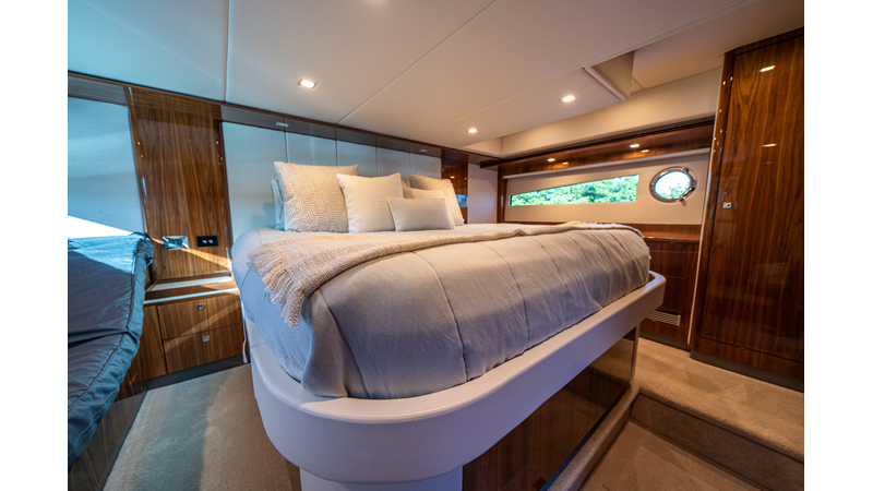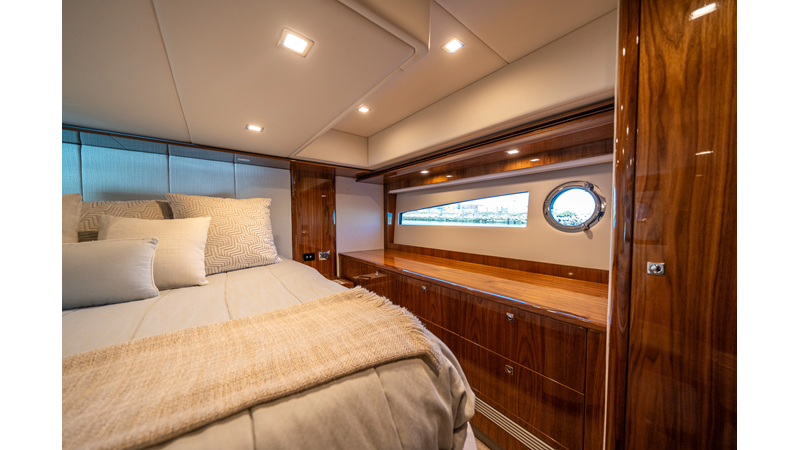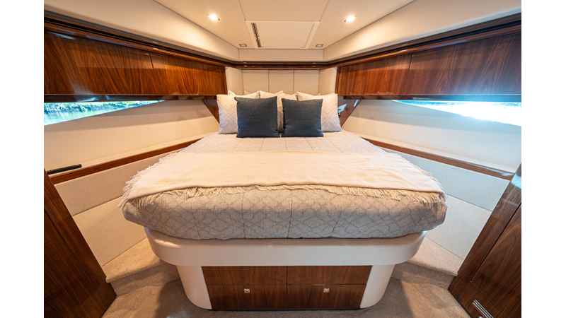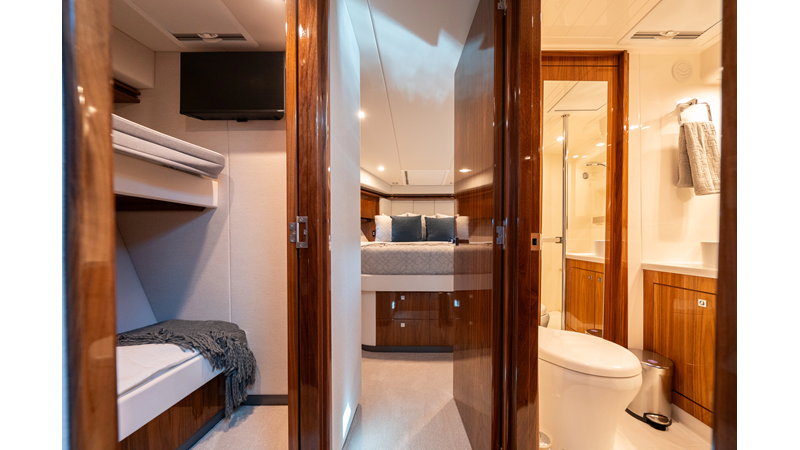 Below deck, WATERDOG offers a three-stateroom, two-head layout, highlighted by a full-beam master suite with a private ensuite. Every detail reflects Riviera’s commitment to craftsmanship and comfort, from the high-gloss timber finishes to the thoughtful integration of light, texture, and space.