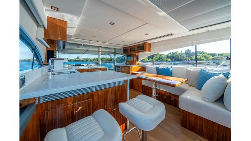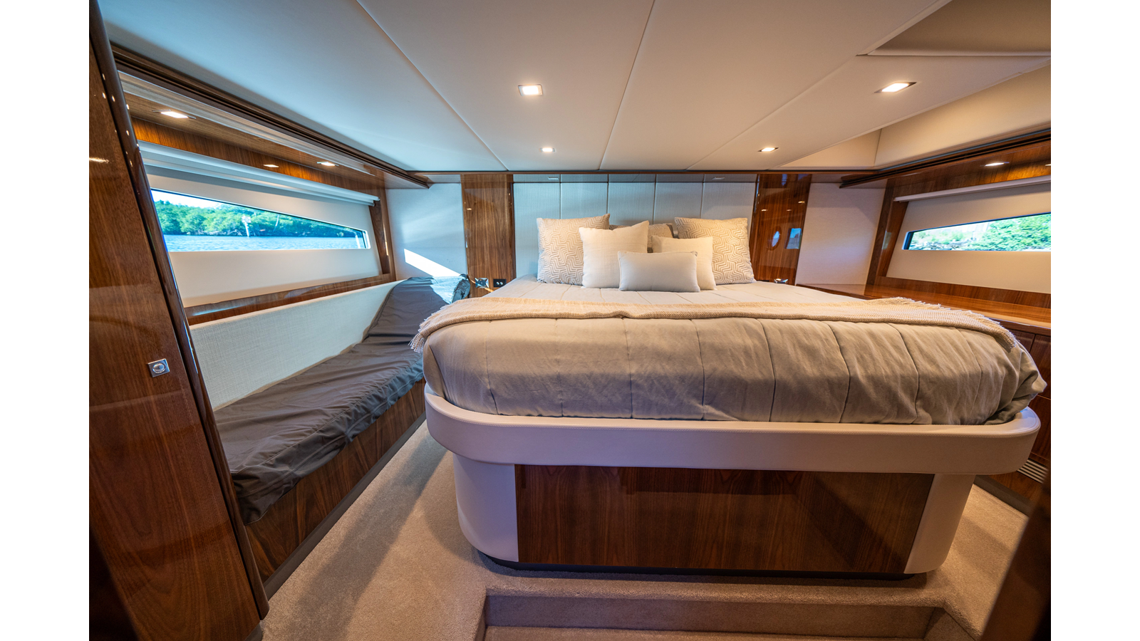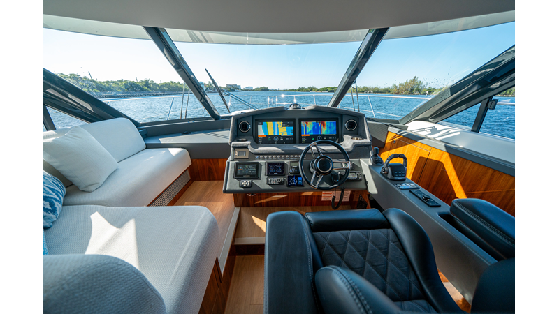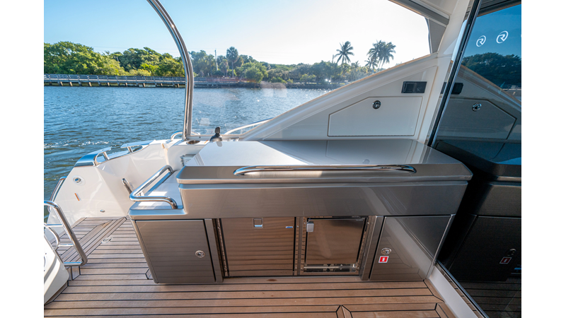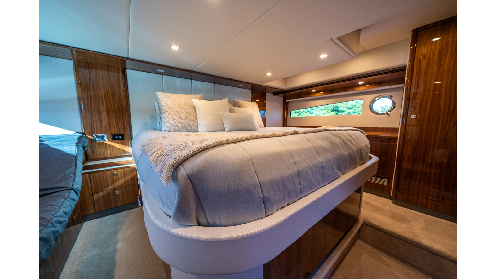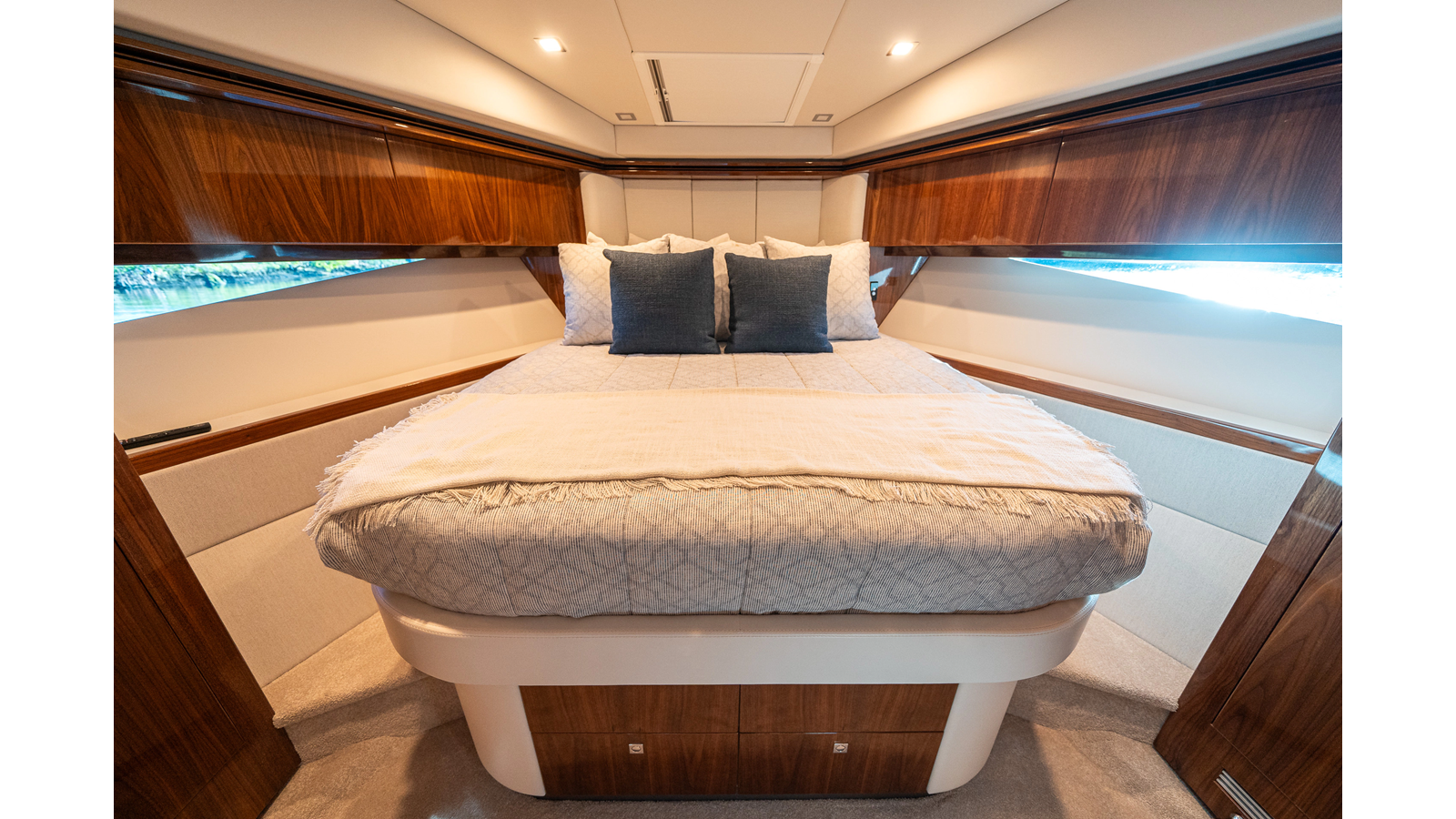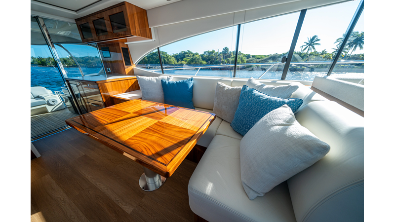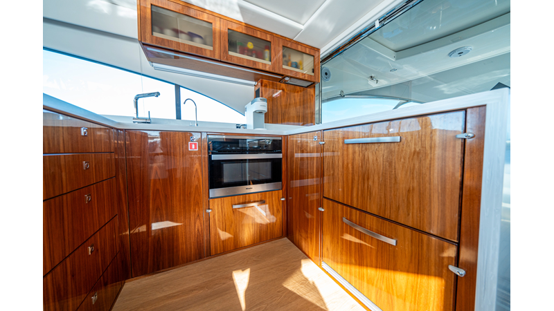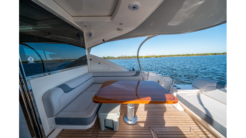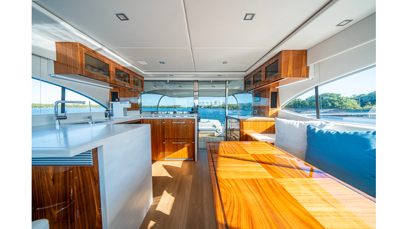 Below deck, WATERDOG offers a three-stateroom, two-head layout, highlighted by a full-beam master suite with a private ensuite. Every detail reflects Riviera’s commitment to craftsmanship and comfort, from the high-gloss timber finishes to the thoughtful integration of light, texture, and space.