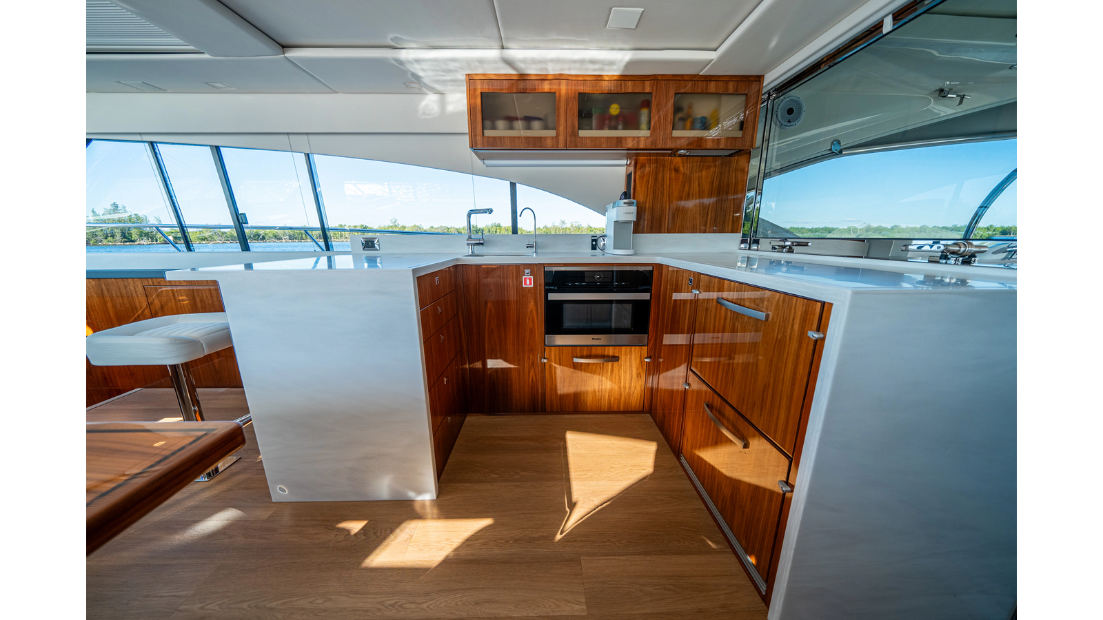 Even before you step aboard, the yacht’s sleek profile, recessed hull windows, and sculpted lines make an immediate impression. Once inside, her spacious volume is immediately apparent, with an open layout that flows from the expansive cockpit through to the luxurious salon and below to the well-appointed accommodations.