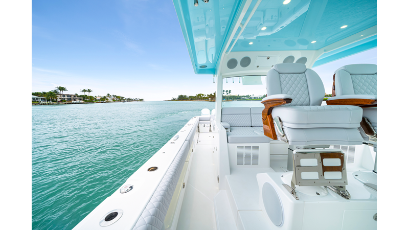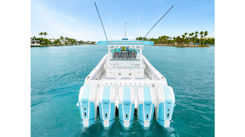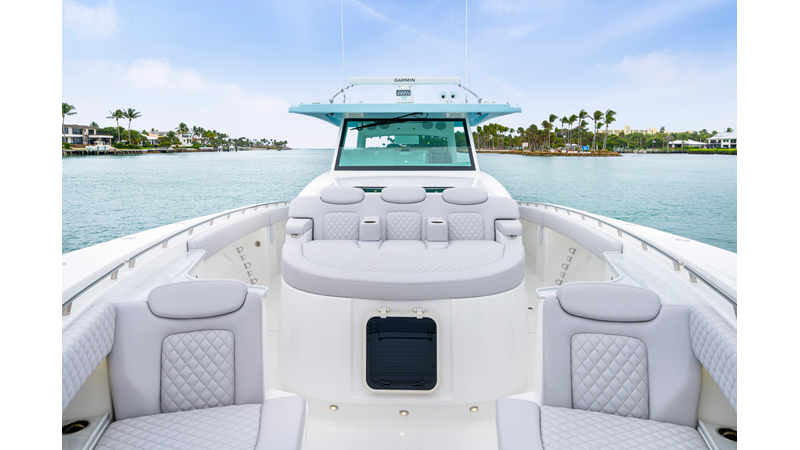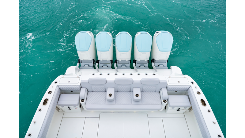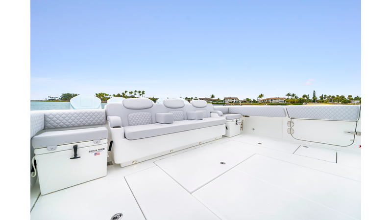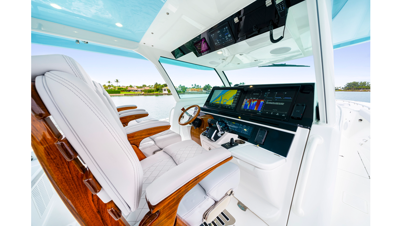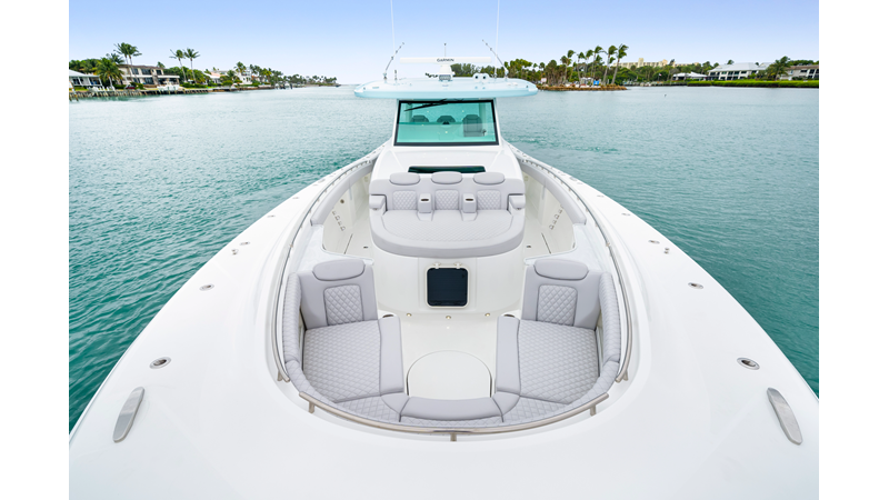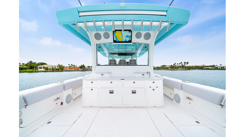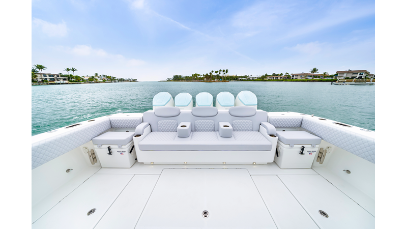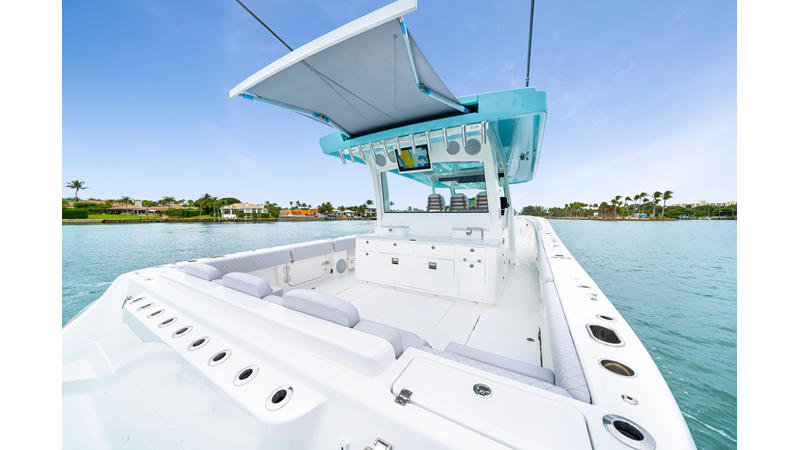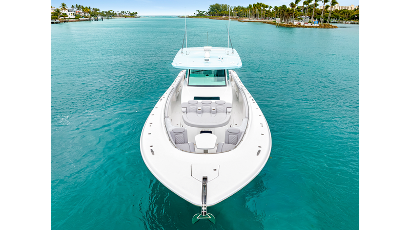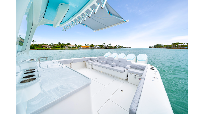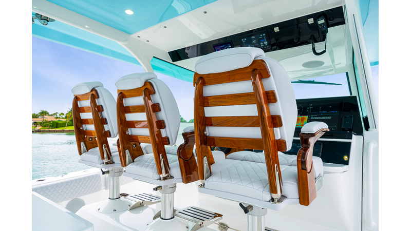 Notable Features: • Quint Mercury V12 600 HP • SeaKeeper 10 • Fisher Panda 15KW generator w/ water-separated exhaust & 55-gal diesel tank • Custom hardtop gelcoat & color-matched engine paint • Release Marine triple helm seats w/ teak ladder backs • Helm A/C plus secondary cockpit A/C unit • Tempered glass aft wind blocker • Electronic aft sunshade (recessed into hardtop) • Garmin 24" upgraded helm screens • Garmin aft-facing screen, AIS system, 6′ radar, XM Weather • JL Audio Luxe flush-mount speaker upgrade • Stainless steel steering wheel w/ high-gloss teak rim & power knob • Bentley or diamond pattern premium stitching • Gem Lux outriggers & rod holder upgrade • Electric reel outlets • Transom seat w/ dual 25-gal baitwell & molded armrests • Port & starboard 38qt transom cooler seats