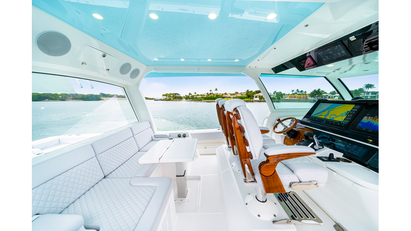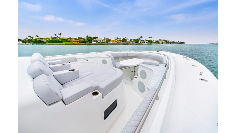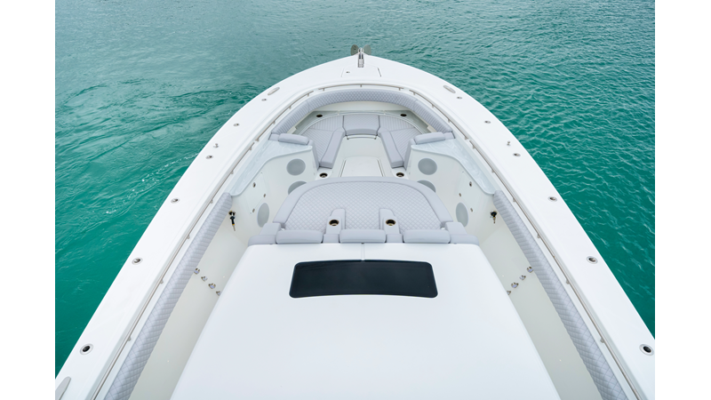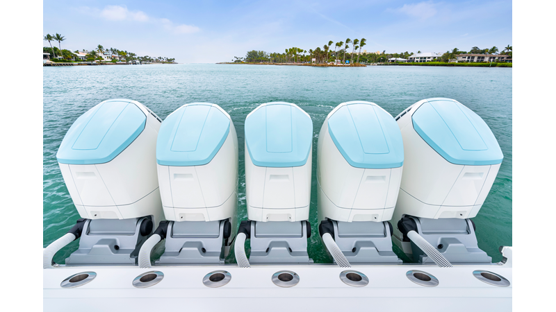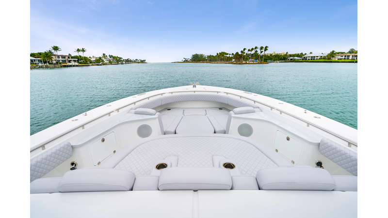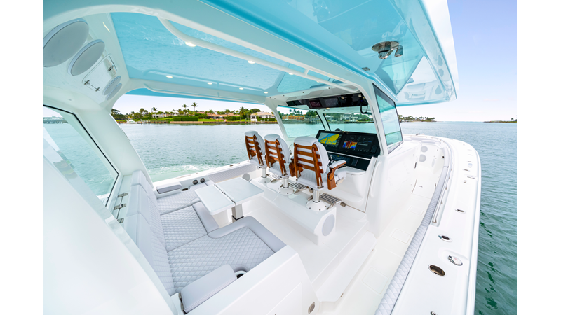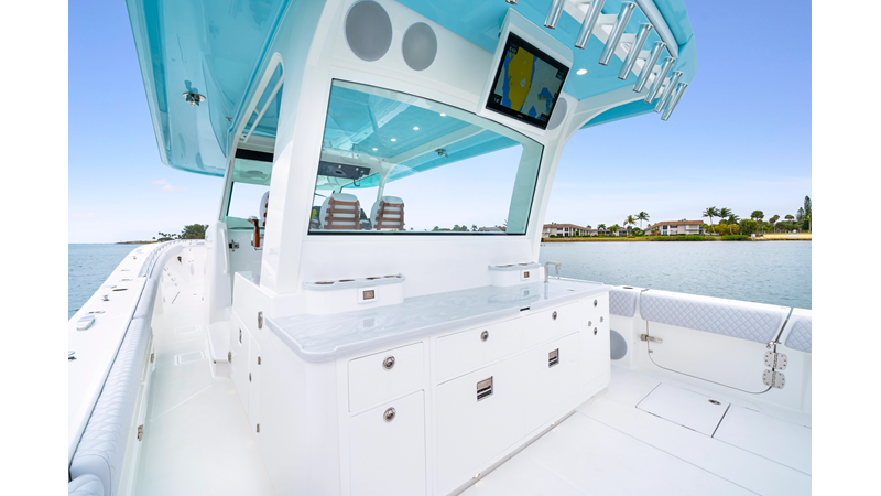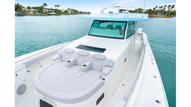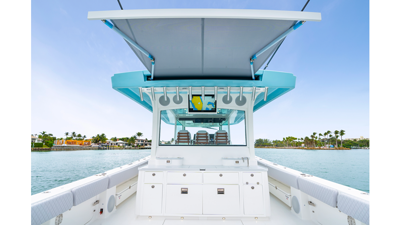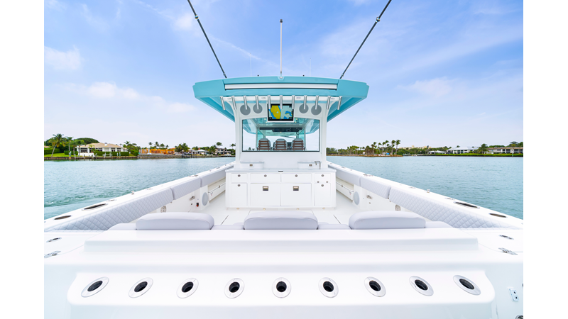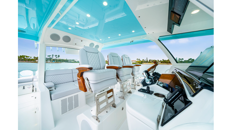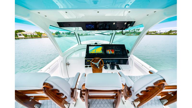 Notable Features: • Quint Mercury V12 600 HP • SeaKeeper 10 • Fisher Panda 15KW generator w/ water-separated exhaust & 55-gal diesel tank • Custom hardtop gelcoat & color-matched engine paint • Release Marine triple helm seats w/ teak ladder backs • Helm A/C plus secondary cockpit A/C unit • Tempered glass aft wind blocker • Electronic aft sunshade (recessed into hardtop) • Garmin 24" upgraded helm screens • Garmin aft-facing screen, AIS system, 6′ radar, XM Weather • JL Audio Luxe flush-mount speaker upgrade • Stainless steel steering wheel w/ high-gloss teak rim & power knob • Bentley or diamond pattern premium stitching • Gem Lux outriggers & rod holder upgrade • Electric reel outlets • Transom seat w/ dual 25-gal baitwell & molded armrests • Port & starboard 38qt transom cooler seats