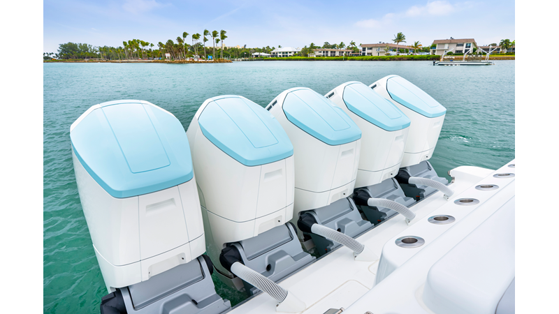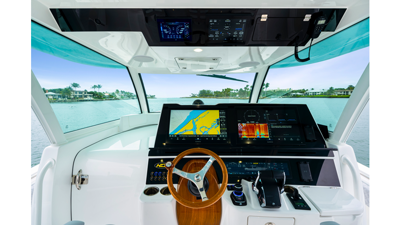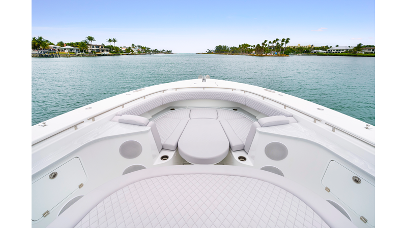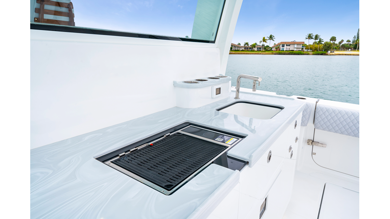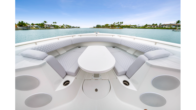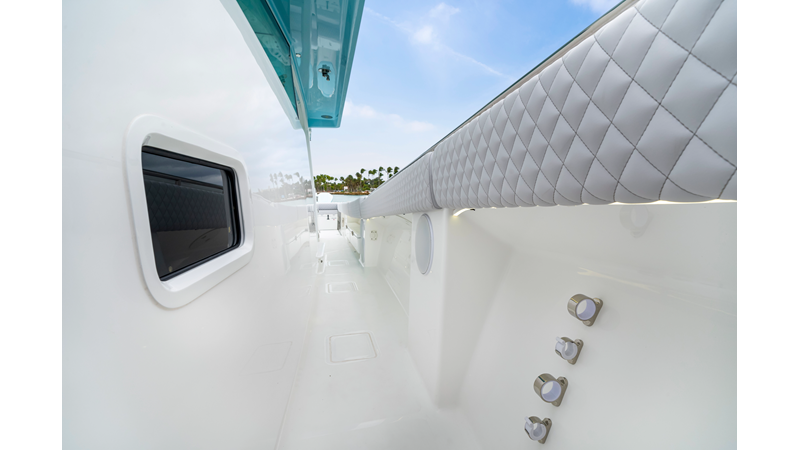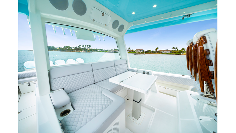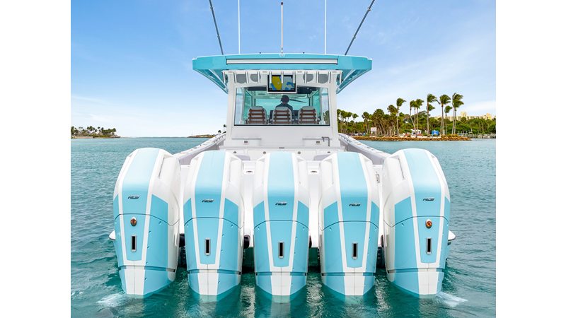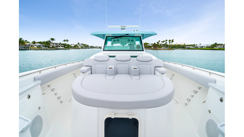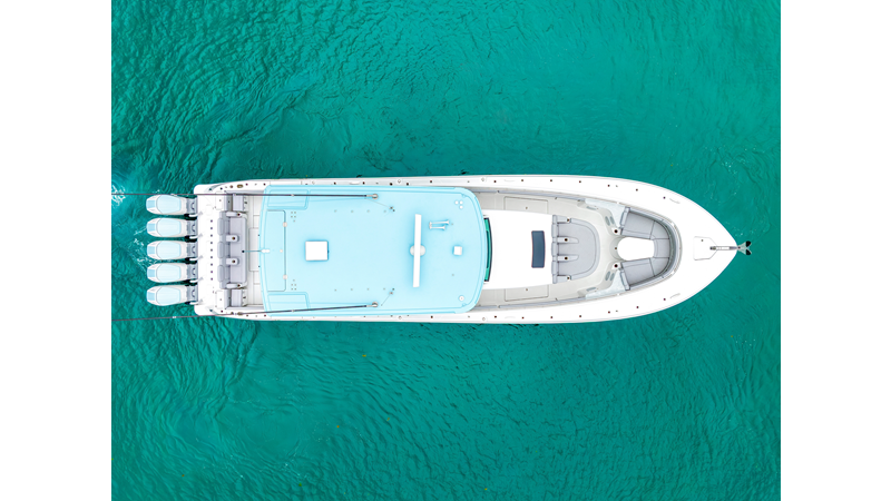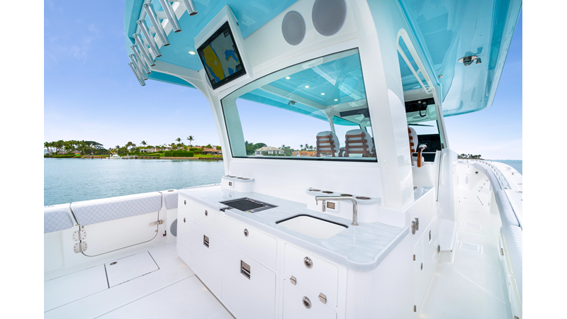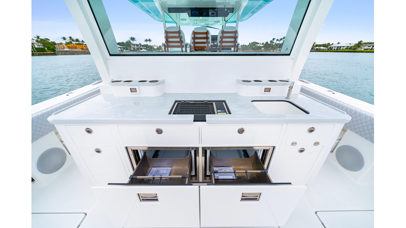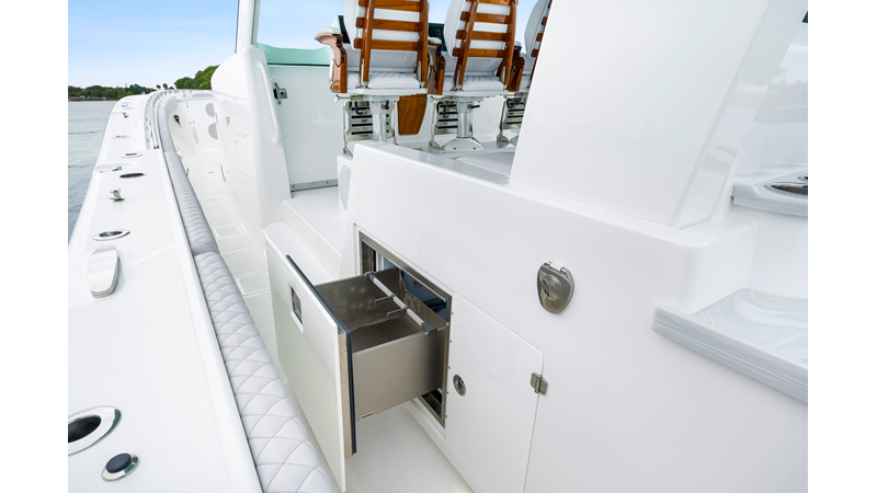 Notable Features: • Quint Mercury V12 600 HP • SeaKeeper 10 • Fisher Panda 15KW generator w/ water-separated exhaust & 55-gal diesel tank • Custom hardtop gelcoat & color-matched engine paint • Release Marine triple helm seats w/ teak ladder backs • Helm A/C plus secondary cockpit A/C unit • Tempered glass aft wind blocker • Electronic aft sunshade (recessed into hardtop) • Garmin 24" upgraded helm screens • Garmin aft-facing screen, AIS system, 6′ radar, XM Weather • JL Audio Luxe flush-mount speaker upgrade • Stainless steel steering wheel w/ high-gloss teak rim & power knob • Bentley or diamond pattern premium stitching • Gem Lux outriggers & rod holder upgrade • Electric reel outlets • Transom seat w/ dual 25-gal baitwell & molded armrests • Port & starboard 38qt transom cooler seats