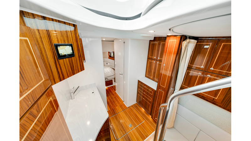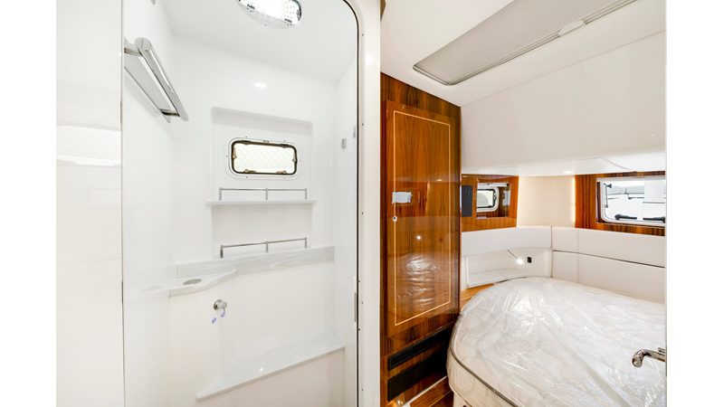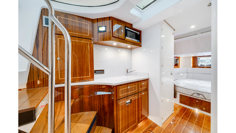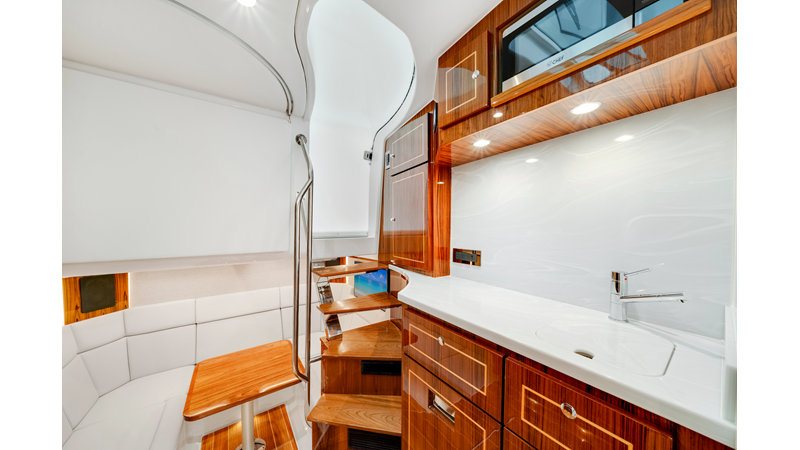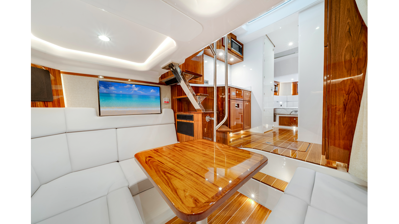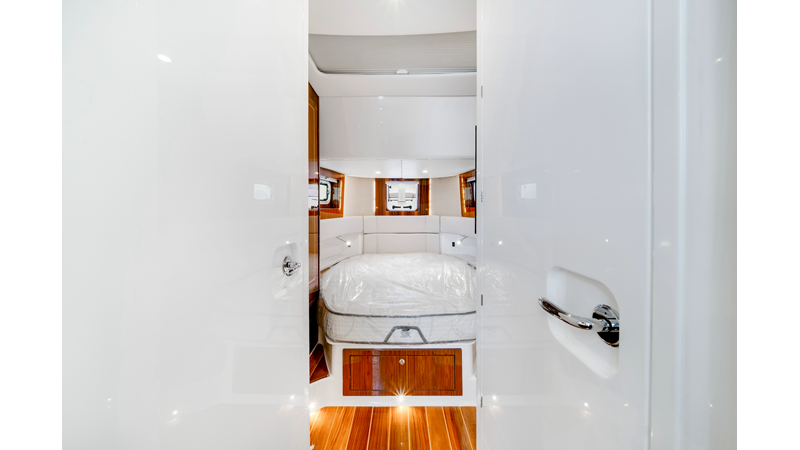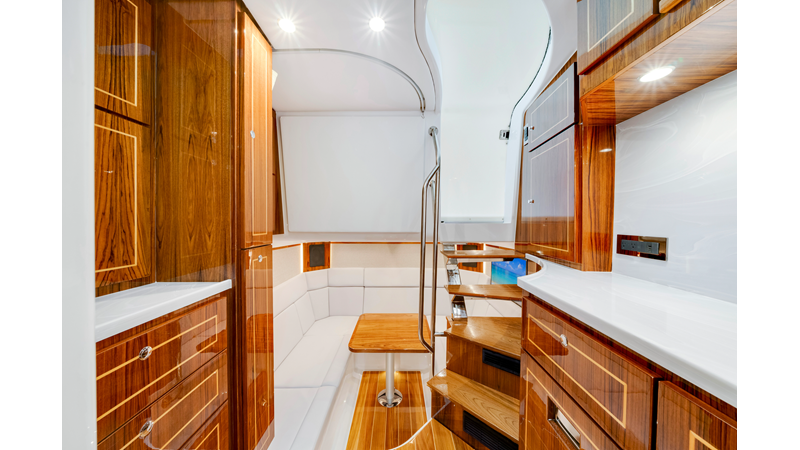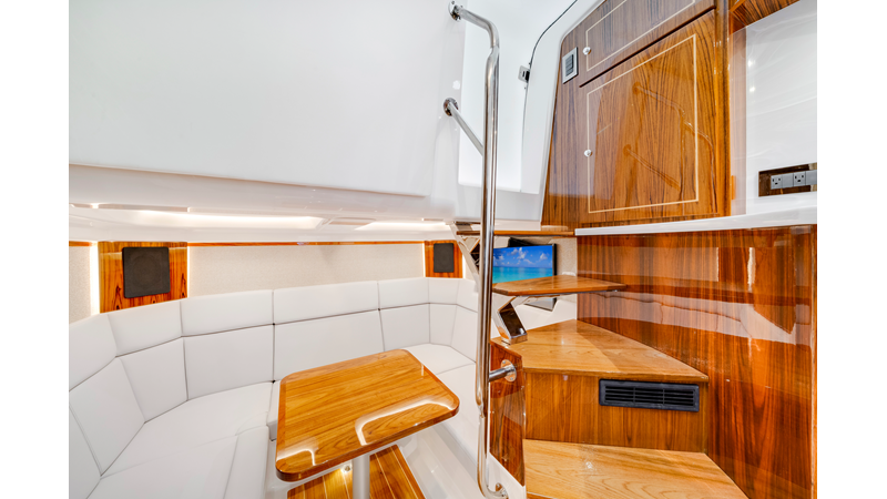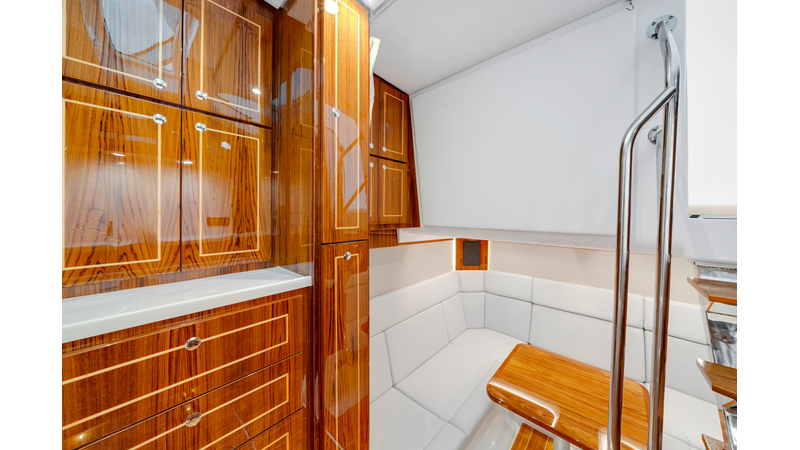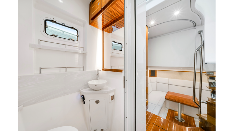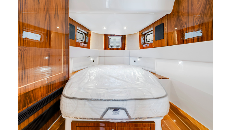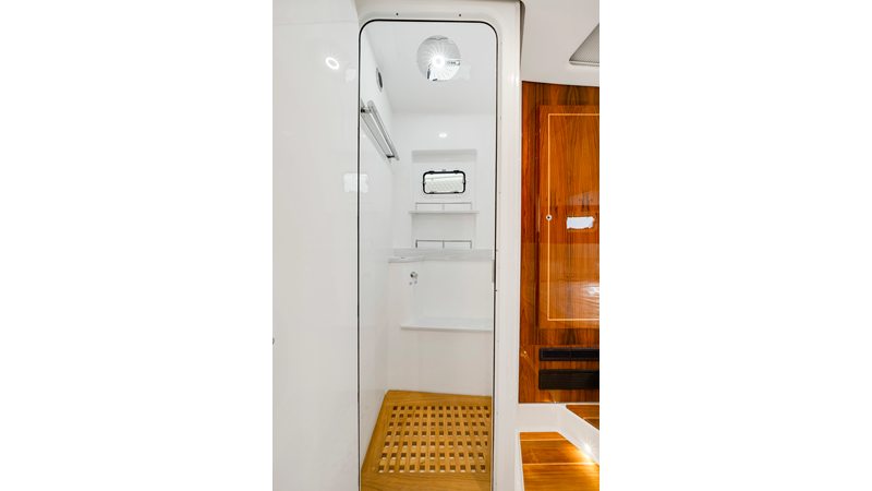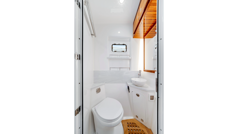 Notable Features: • Quint Mercury V12 600 HP • SeaKeeper 10 • Fisher Panda 15KW generator w/ water-separated exhaust & 55-gal diesel tank • Custom hardtop gelcoat & color-matched engine paint • Release Marine triple helm seats w/ teak ladder backs • Helm A/C plus secondary cockpit A/C unit • Tempered glass aft wind blocker • Electronic aft sunshade (recessed into hardtop) • Garmin 24" upgraded helm screens • Garmin aft-facing screen, AIS system, 6′ radar, XM Weather • JL Audio Luxe flush-mount speaker upgrade • Stainless steel steering wheel w/ high-gloss teak rim & power knob • Bentley or diamond pattern premium stitching • Gem Lux outriggers & rod holder upgrade • Electric reel outlets • Transom seat w/ dual 25-gal baitwell & molded armrests • Port & starboard 38qt transom cooler seats