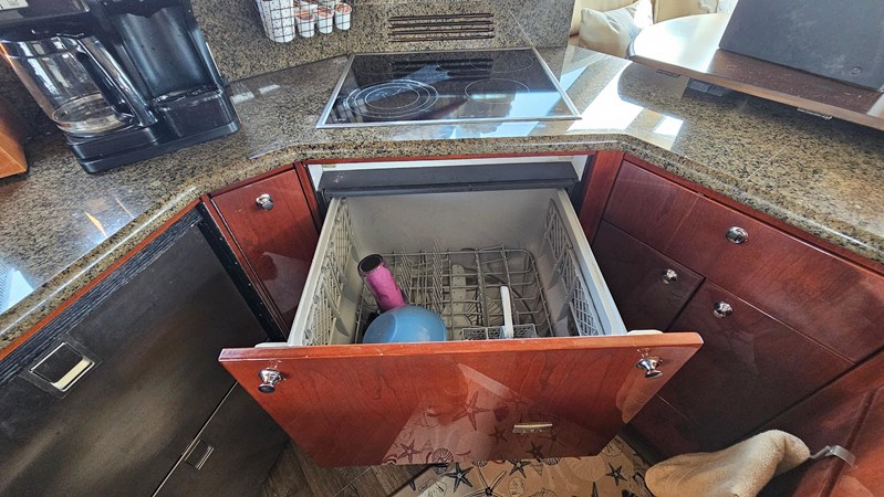 I LOVE my BOAT. I….mean….I REALLY LOVE my BOAT. I Love it when I pull up to a dock standing at midship along the full length stainless steel railings, with my Yacht Controller, sliding the boat into the slip sideways using the bow and stern thrusters, while onlookers ask “Who’s driving the boat?”. I LOVE the power of the two American made Caterpillar 3406 diesels pushing the Canadian made 56’ of luxury. I LOVE it when my family and friends sit on the two newly updated sun platforms while I sit over watching from the FULL length, air conditions and enclosed Fly Bridge by the upper helm. I LOVE when my 92 year old Mom could easily Walk up the Staircase to the bridge along with my 50 pound dog. And I must mention, he sheds. So, the Salon wood floors make vacuuming a breeze. Even when he sits watching the 42” flat panel TV on the newly remade salon couches, next to the wine cooler fridge. Speaking of “fridges”, we replaced the “door” galley fridge with a much more functional dual drawer slide out unit. Oh, and the Dog, Teddy, loves the inflatable dinghy. Especially when the swim platform hydraulically goes up and down, launching into the water. Watch out DUCKS!