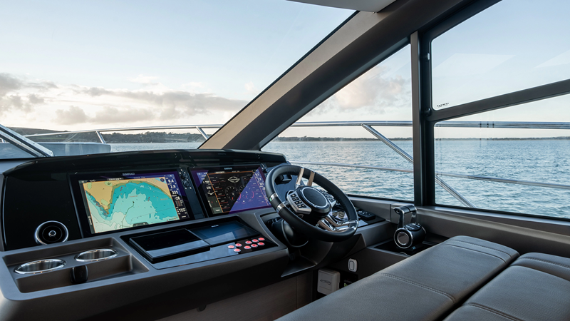 The 2026 Manhattan 56 introduces a bold new exterior identity, characterised by a sleeker, more contemporary silhouette and flowing lines that convey both intent and elegance. An extended run of main-deck glazing stretches cleanly along the profile, drawing abundant natural light into the interior while enhancing the connection to the surrounding seascape. She also debuts Sunseeker’s latest exterior upholstery collection, distinguished by precise tailoring, refined piping and carefully executed stitch detailing. The result is a sophisticated finish that reflects exceptional British craftsmanship, balancing durability with subtle luxury.