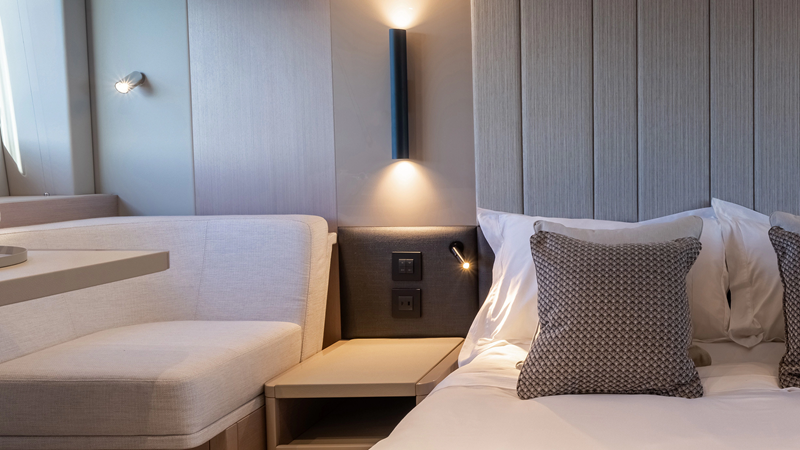 At the stern, the aft cockpit has been entirely transformed into a versatile, sociable setting. Innovative modular seating enables the space to shift seamlessly between dining area, relaxed lounge and expansive full-beam sunpad, offering impressive flexibility for entertaining or unwinding. The open-plan arrangement flows effortlessly to the swim platform and Beach Club, establishing an inviting waterside retreat.