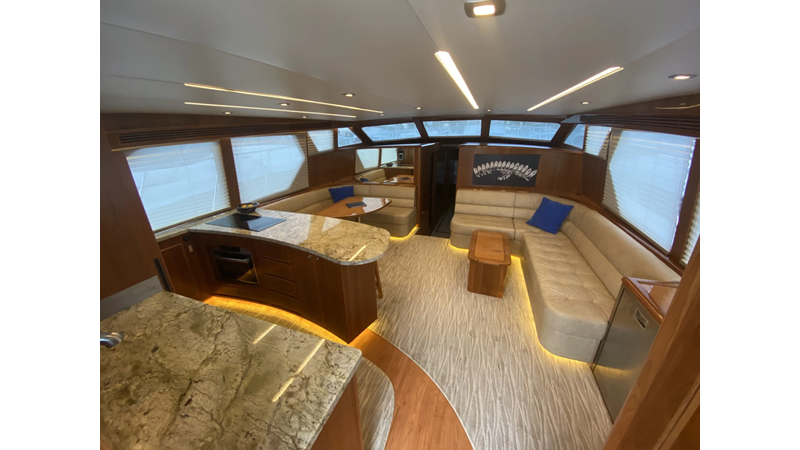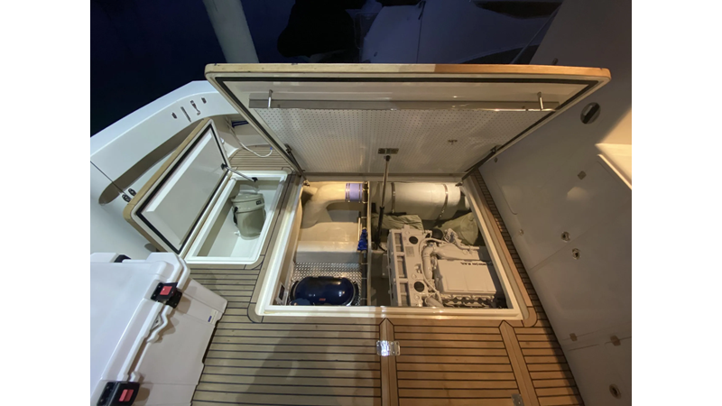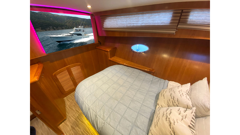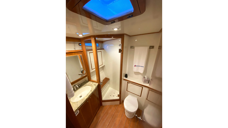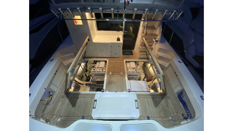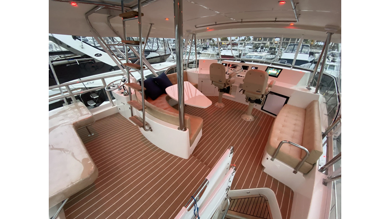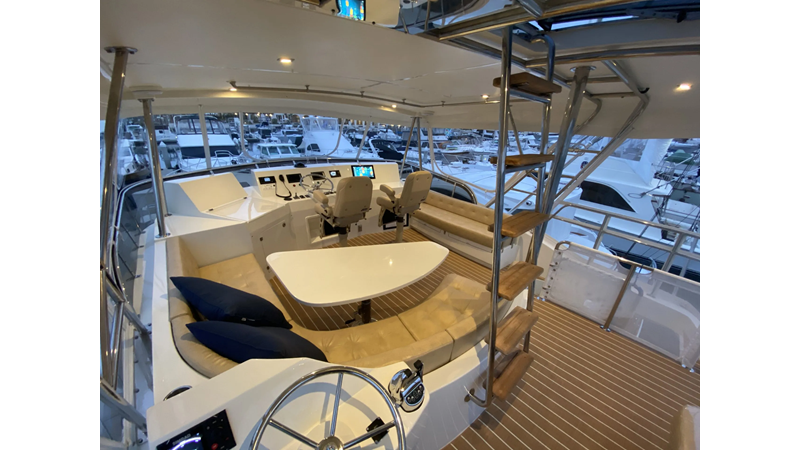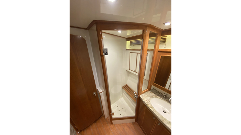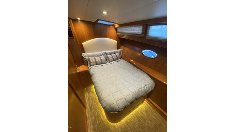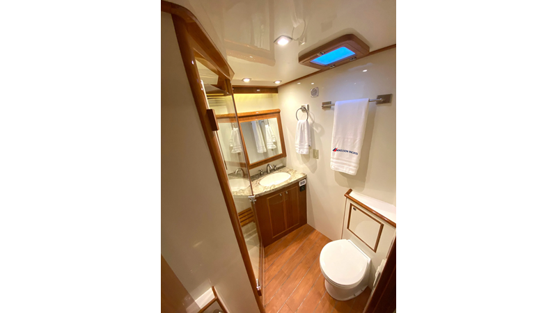 Equipped with a stand-up engine room and a cockpit day head with shower, this yacht also boasts a generous 1,200-gallon fuel capacity. With standard 715hp QSM-11 Cummins engines or the option of 800hp MAN “Common Rail” diesels, the Mikelson 57 is a powerhouse, offering a top-of-the-line boating experience. The generous stand-up engine room provides easy access to all systems, and the largest flying bridge in its class makes the Mikelson 57 a must-see.