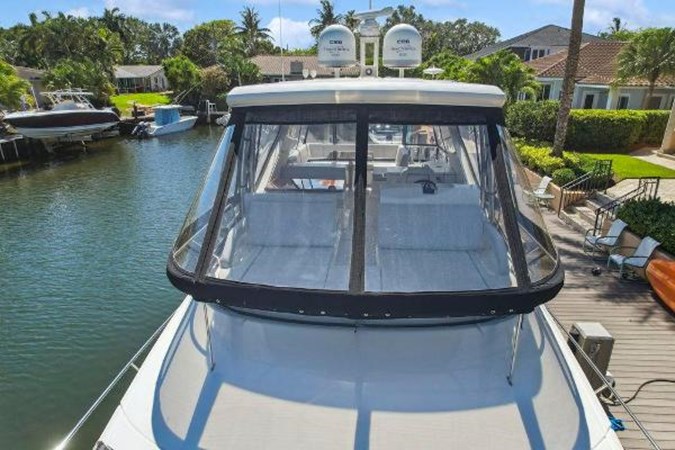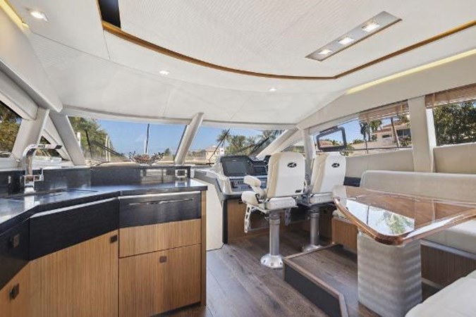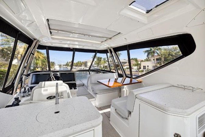 GRATITUDE boasts a commanding presence on the water, characterized by its streamlined hull and expansive flybridge. The flybridge serves as a versatile outdoor living space, complete with a helm station, plush seating, a dining area, cooktop, and a wet bar. A retractable hardtop allows for an open-air experience or shaded comfort.