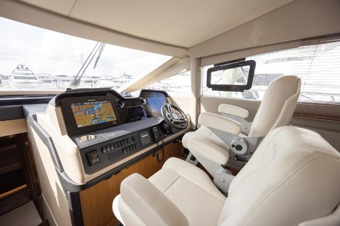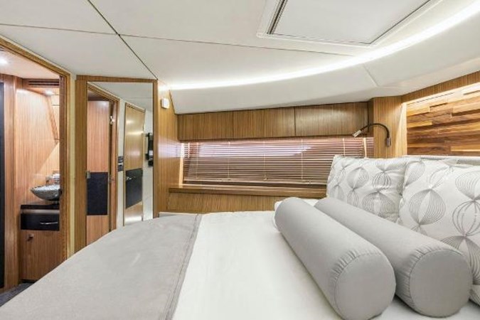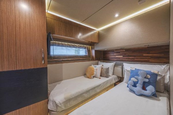 Below deck, the L590 accommodates up to six guests in three staterooms and two heads, including a full-beam master suite with a luxurious en-suite bathroom. A forward VIP stateroom and a twin-berth guest cabin ensure comfort for all onboard.