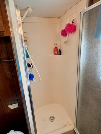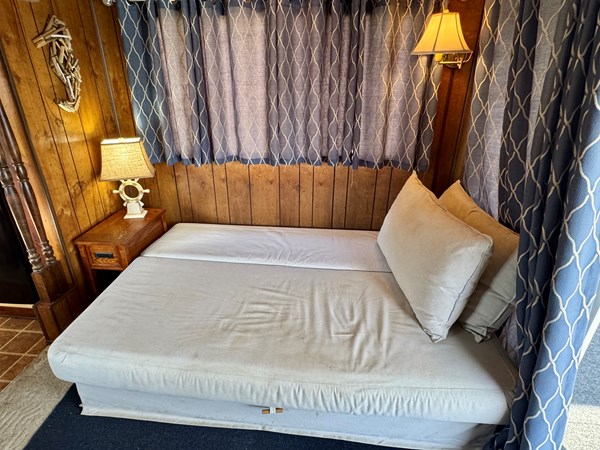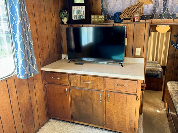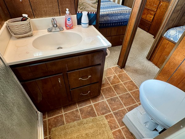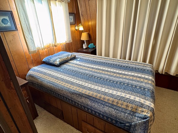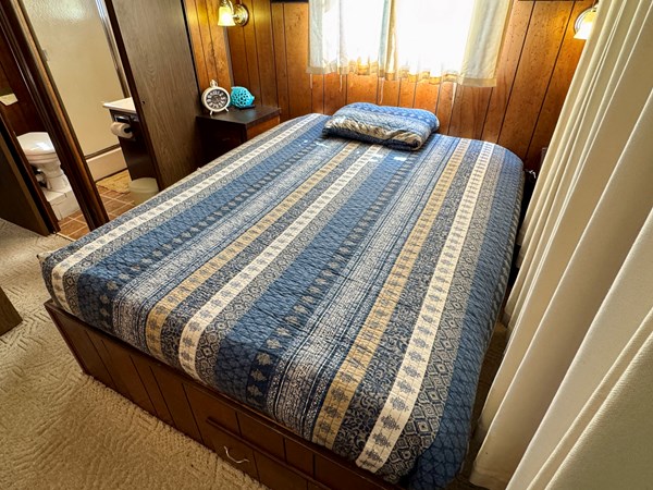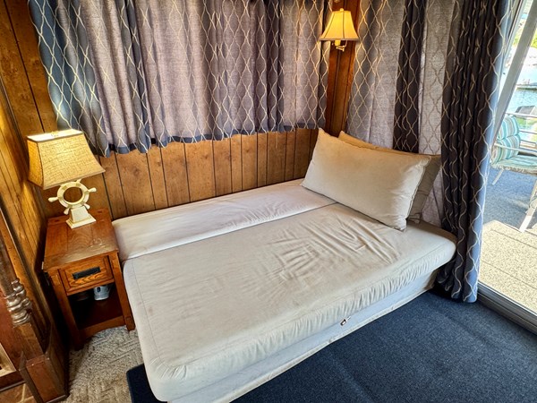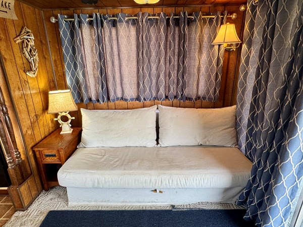 This 1977 Sumerset 14 x 58 Aluminum Hull Houseboat with Catwalks For Sale on Norris Lake Tennessee includes a 12′ 4 ” x 60′ 4” dock constructed on encapsulated styrofoam flotation with lumber framing and decking and includes a storage shed, ShoreMaster PWC port/float, a water slide and a shore power cable. The Houseboat is equipped with a MerCruiser 898 V8 inboard/outboard engine and a Champion air-cooled generator. The interior features 2 convertible sofas in the main salon along with a galley kitchen equipped with an electric refrigerator/freezer, a gas oven/range, microwave, coffee maker, double stainless sink, and a charbroil gas grill with a side burner is just outside. The galley and main salon features an over-head roof-mount air conditioning unit with heat, while a 1500 watt infrared portable heater is also included. Down a few steps towards the aft you’ll pass through twin over full size bunk bed in the hallway with a full bathroom featuring a new marine head, vanity sink, and walk-in shower that is shared with the master stateroom that features a queen size bed, two nightstands, two closets, an integrated dresser, and another roof-mount air conditioning unit is overhead. Onboard entertainment is available via a pair of Roku HDTVs and an AM/FM/CD/Aux input stereo. The covered patio features a sun-shade to block the afternoon sunlight, a ceiling fan overhead, and a patio table/chair set. Another table/chair set is located on the attached dock. Upstairs you’ll find a newly gel-coated roof with raised railing feet for moisture prevention and plenty of room for sunbathing. The mooring location on Norris Lake is transferable and includes a shore power cable.